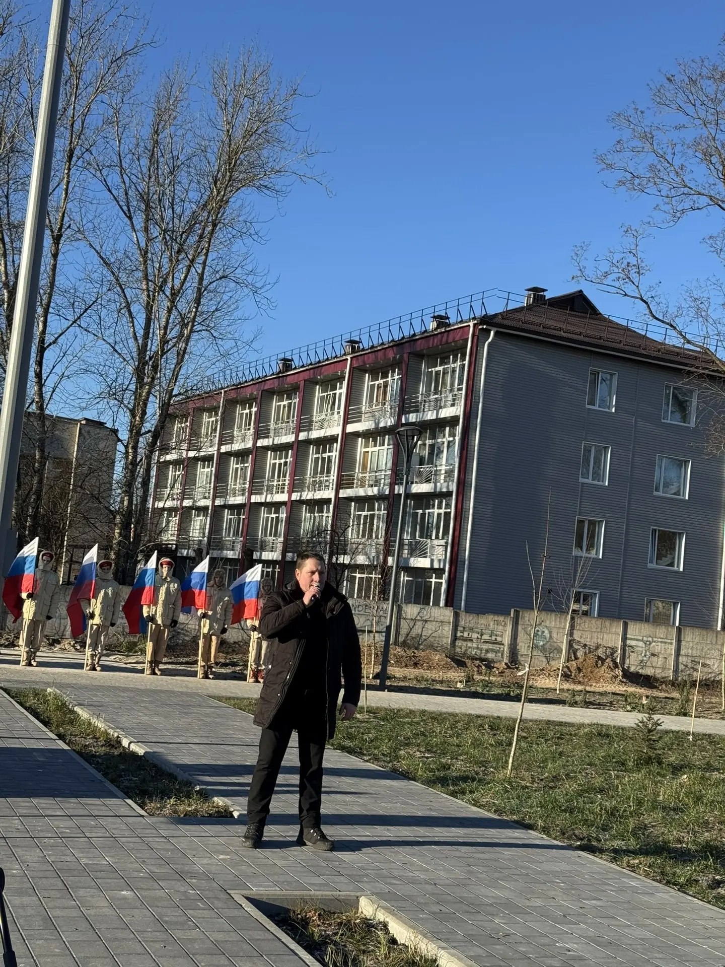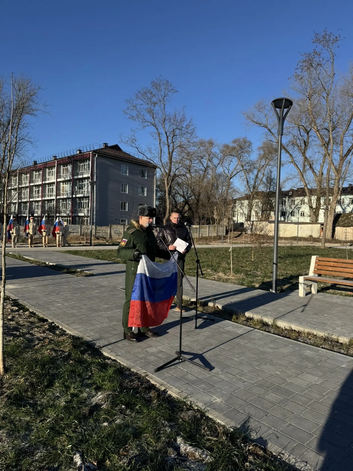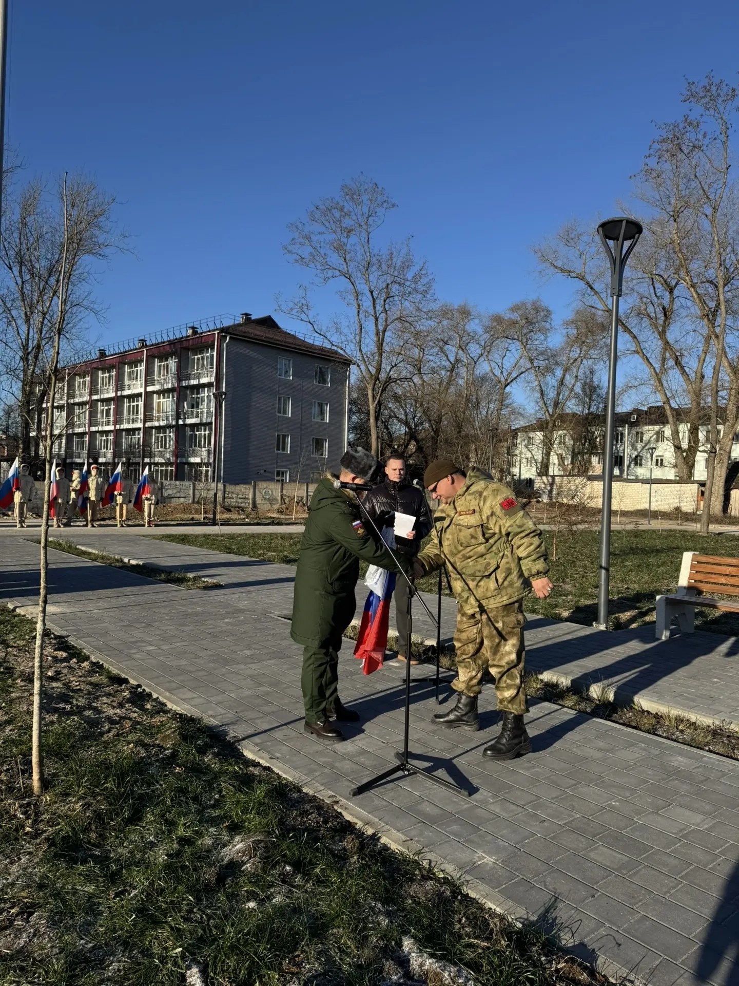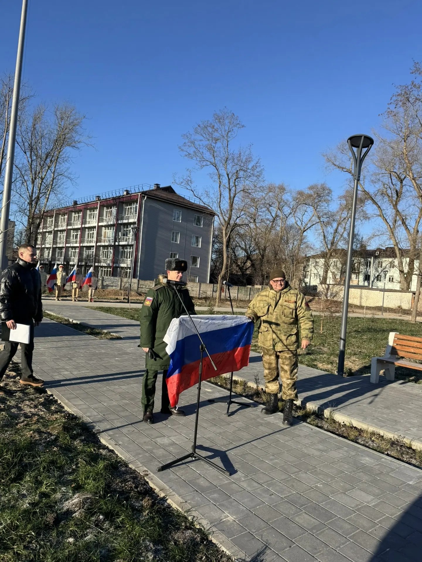 С приветственными словами к присутствующим обратился ветеран боевых действий, участник специальной военной операции Геннадий Николаевич Сподобец. В ходе выступления он передал флаг России с благодарностью и памятными надписями от военнослужащих в музей военно-патриотического центра «Рубеж-32».