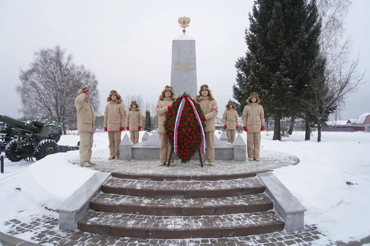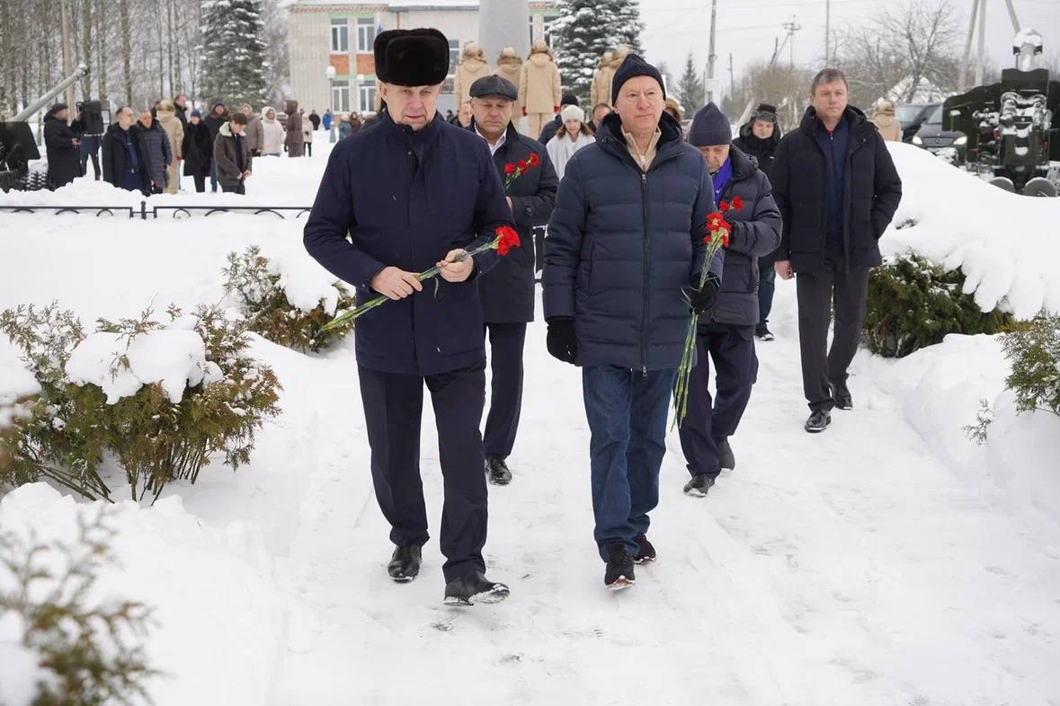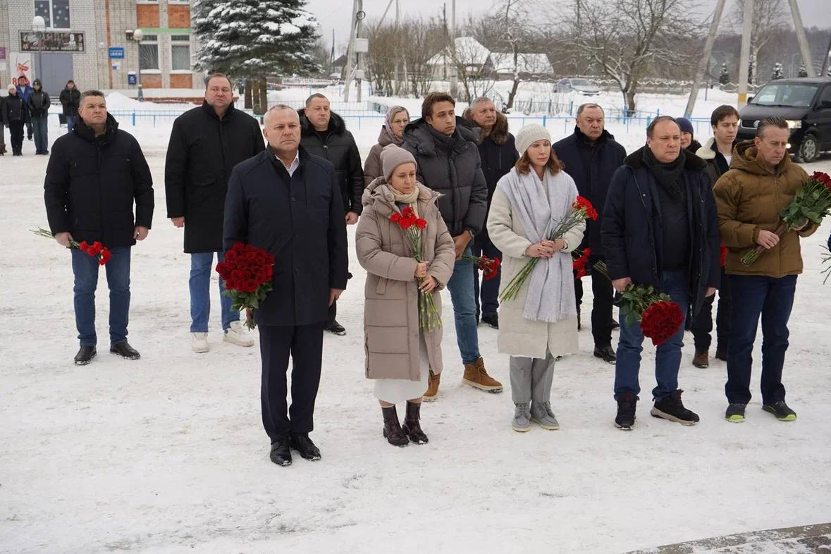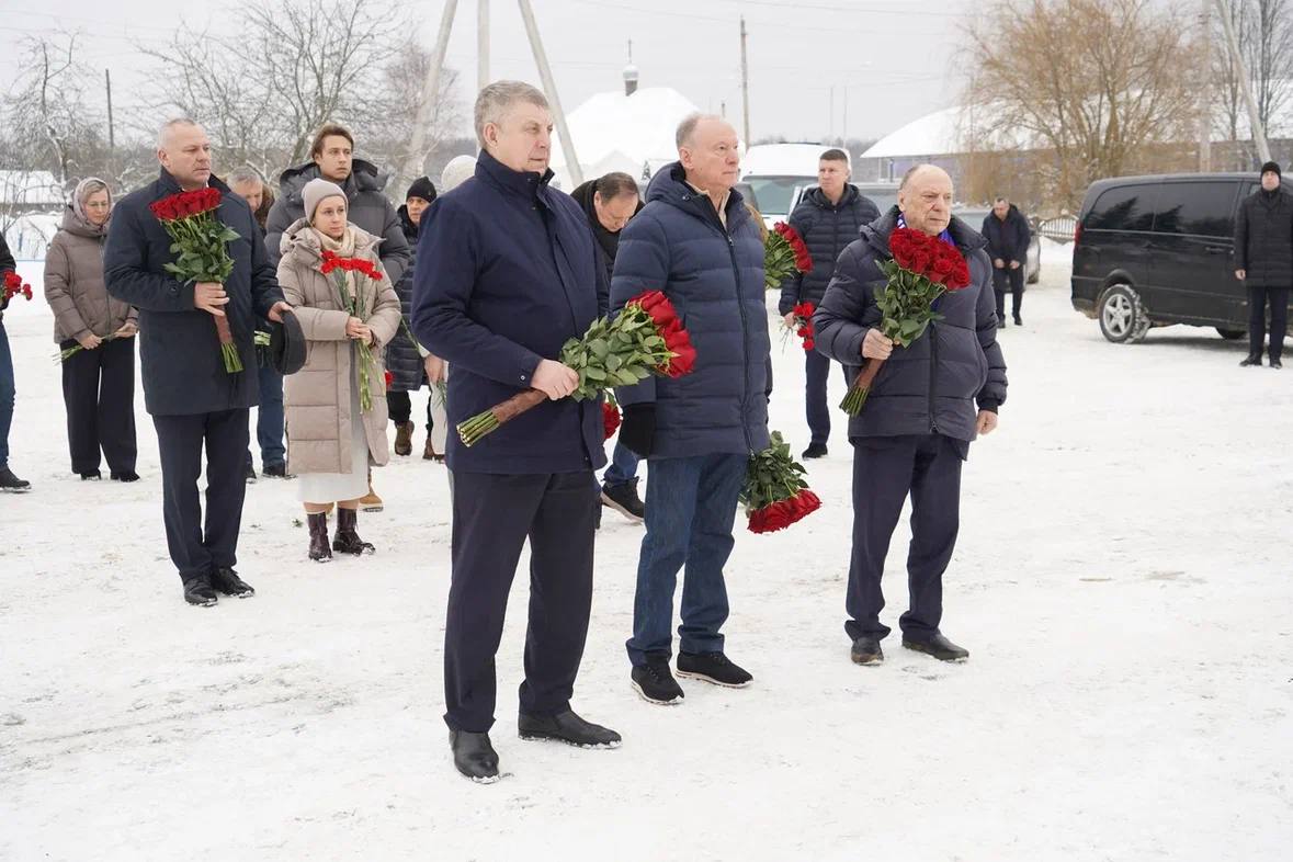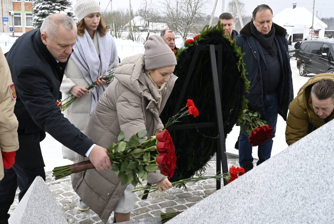 Совместно с Губернаром Александром Богомазом и председателем областной Думы Валентином Субботом почётный гость возложил цветы к воинскому мемориалу в селе Журиничи, посвященному памяти советских воинов, партизан, мирных жителей, погибших в годы Великой Отечественной войны.