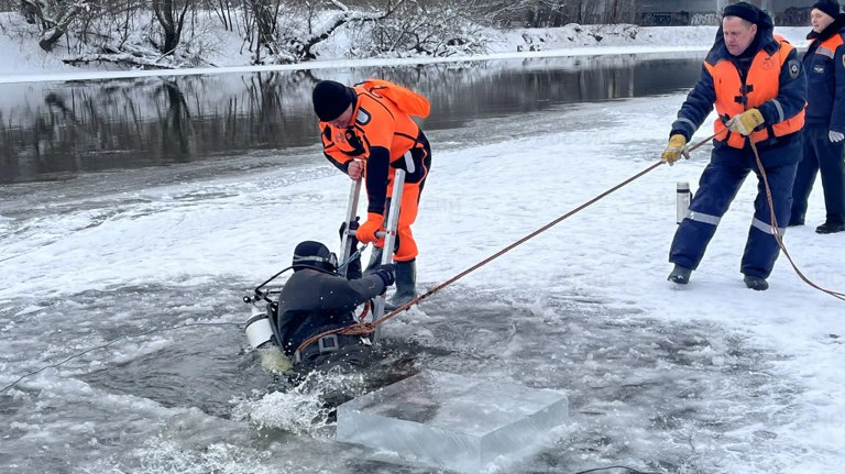 В образовавшееся отверстие во льду поочерёдно погружаются водолазы, которые обследуют дно реки в предполагаемом месте происшествия. Работы ведутся в сложных условиях — сильное течение, низкие температуры и видимость.