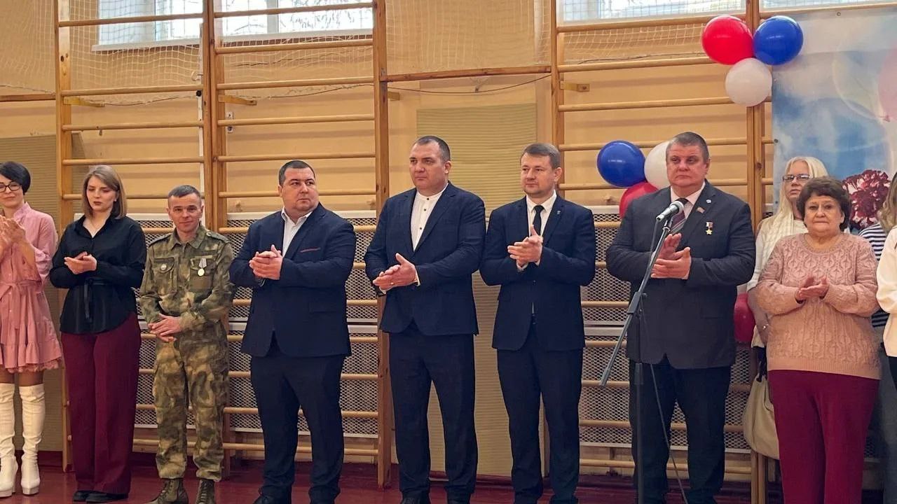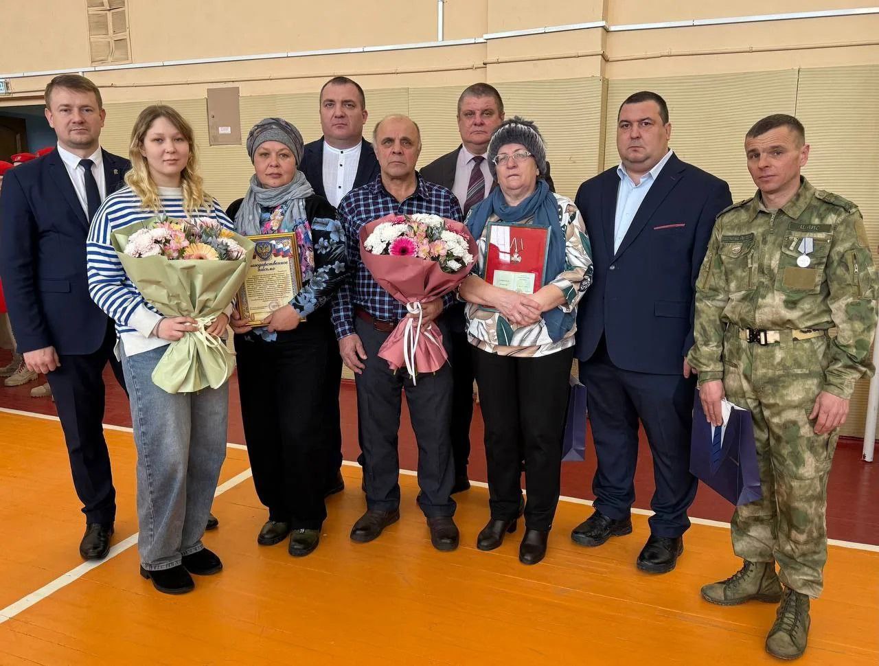 Все присутствующие склонили головы в знак памяти о нашем земляке Потапенко Владимире Валерьевиче, погибшем в ходе СВО. Указом Президента РФ от 04.11.2025 года он награжден Орденом мужества посмертно. Награду вручили родителям Героя Раисе Ивановне и Валерию Александровичу.