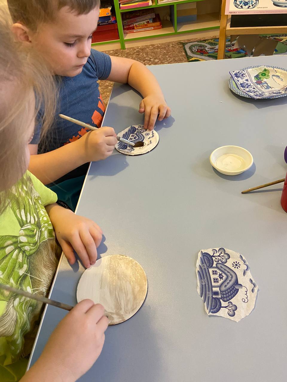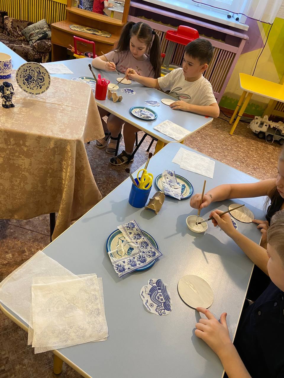 Затем педагог Жемердей Наталья Сергеевна провела мастер -класс «Декупаж в Гжели». Ребята узнали, что декупаж - это особый вид аппликации, которая изготавливается с использованием бумаги, салфеток на дереве, стекле, плотном картоне и многих других поверхностях с многослойным покрытием лаком.