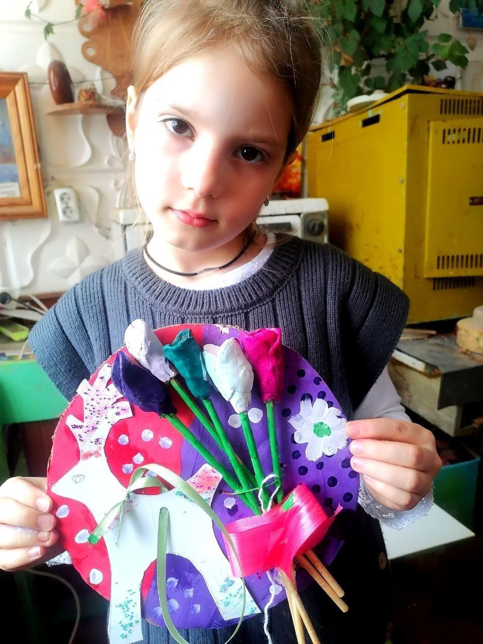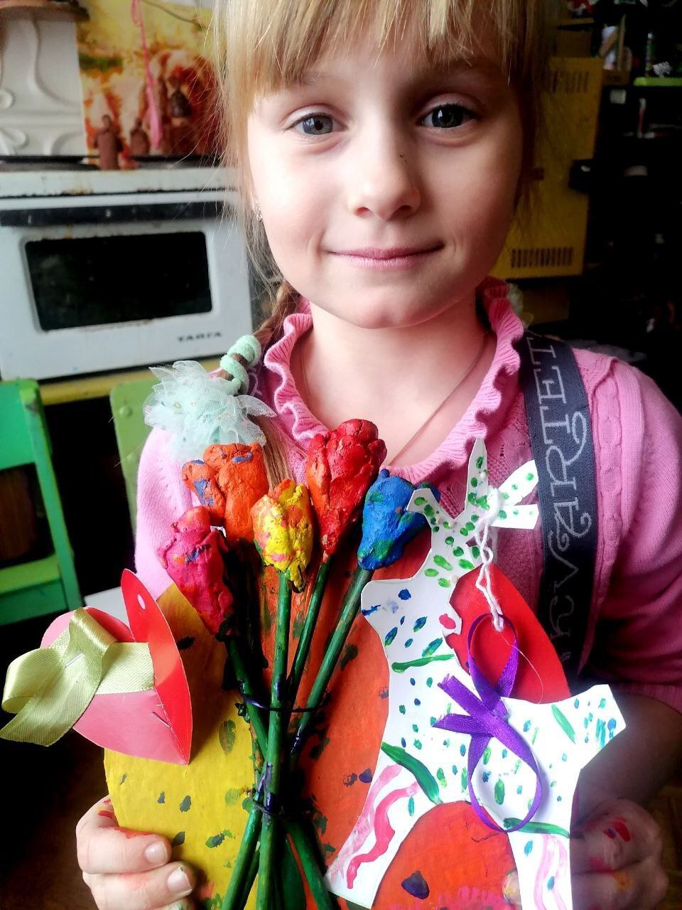 Первый букет защитникам Отечества приготовили на занятиях учащиеся студии "ИЗО и дизайн". На занятиях ребята нашей группы познают гармонию формы и цвета, осуществляют свои задумки. Каждый воспитанник осваивает приёмы, навыки работы с формой и цветом.