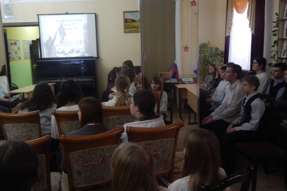 В краеведческой библиотеке им. А.Ф. Землянского 5 февраля для учащихся 7-х классов СОШ №2 им. А.И. Герцена проведён тематический вечер «Главная высота Отчизны», посвящённый защитникам Сталинграда. Учащиеся узнали об основных событиях Сталинградской битвы, героизме людей.