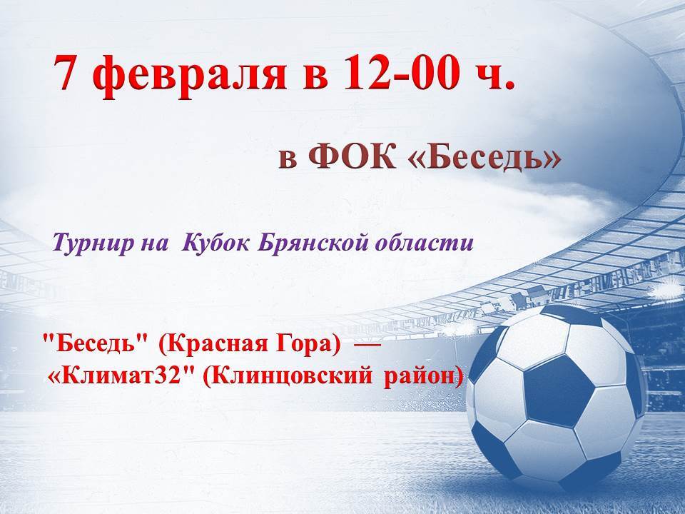 7 февраля 2026 года в физкультурно-оздоровительном комплексе «Беседь» состоится матч по футзалу на Кубок Брянской области. Начало в 12-00 часов.