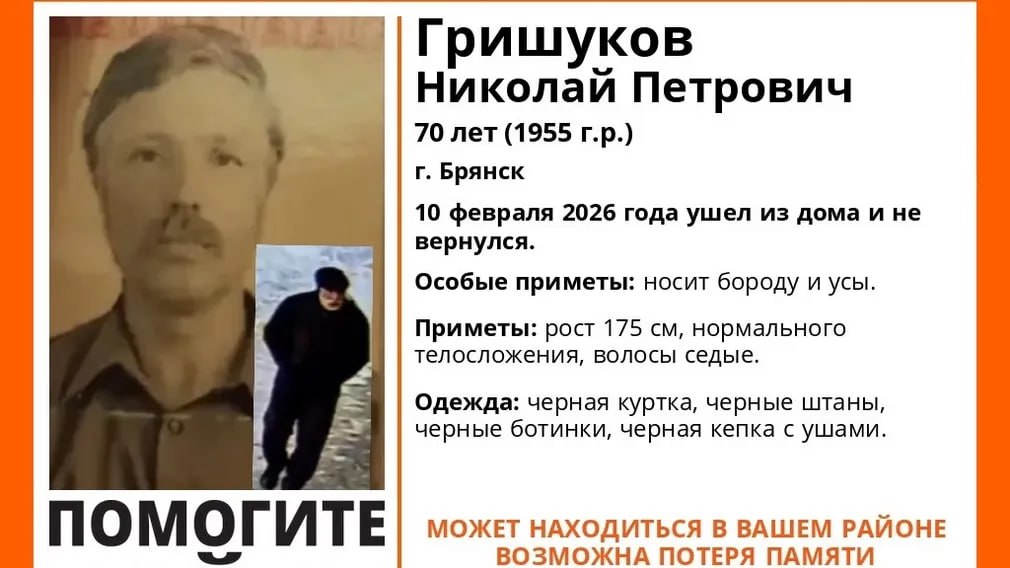 В Брянске разыскивают 70-летнего пропавшего Николая Гришукова. Уточняется, что мужчина ушел из дома 10 февраля 2026 года и не вернулся.