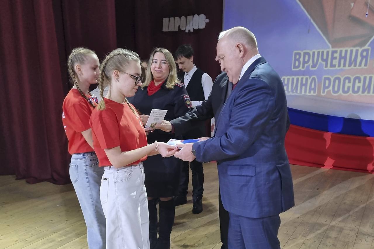 Паспорта, Конституцию РФ, а также фирменные обложки и значки Движения Первых, в торжественной обстановке ребятам вручили: Глава Трубчевского района Василий Васильевич Евсеев, Глава города Трубчевска Николай Иванович Данченко и инспектор отделения по вопросам миграции МО МВД России «Трубчевский», старший лейтенант полиции Анна Григорьевна Боронина.