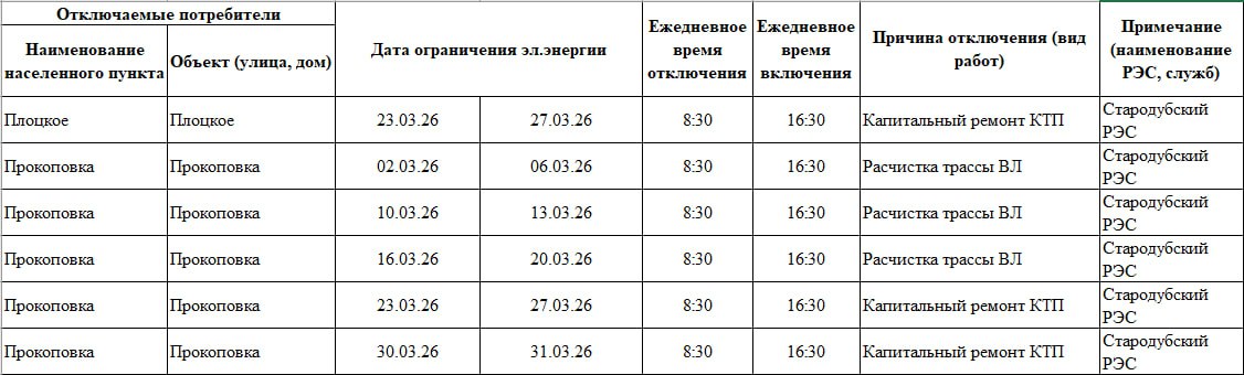 В связи с плановыми ремонтными и профилактическими работами, филиал ПАО «Россети Центр»-«Брянскэнерго» в марте наметил кратковременное отключение энергетических объектов, обеспечивающих энергоснабжение ряда населенных пунктов.