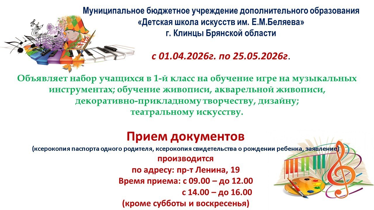 «Детская школа искусств им. Е.М. Беляева» объявляет набор учащихся в 1-й класс на обучение игре на музыкальных инструментах, обучение живописи, акварельной живописи, декоративно-прикладному творчеству, дизайну, театральному искусству.