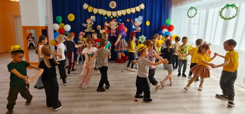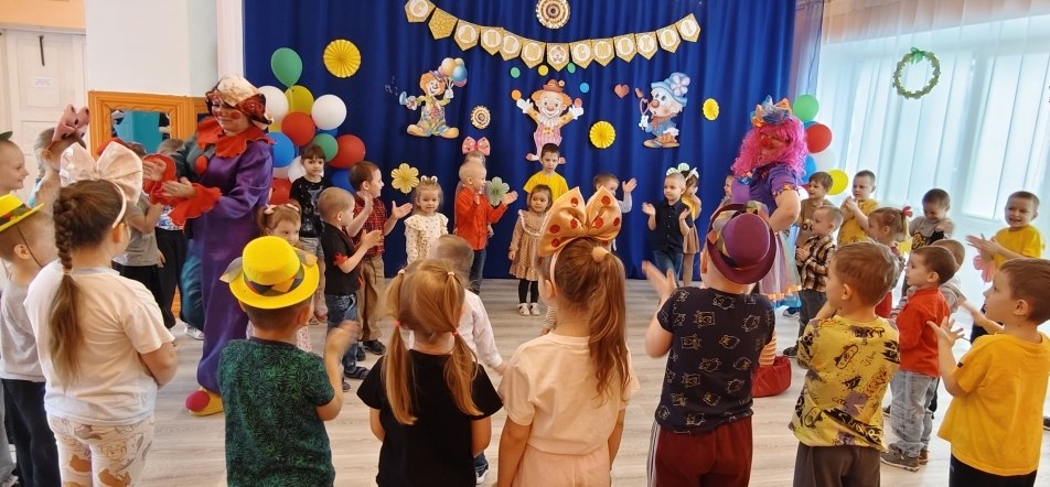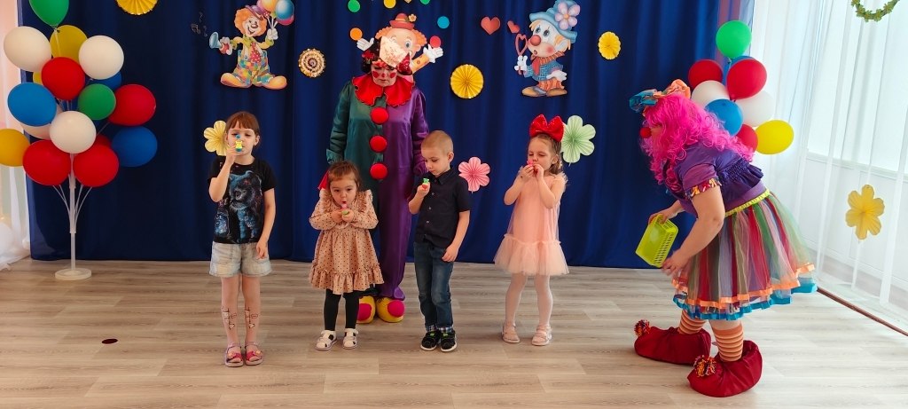 Вместе с клоунами ребята приняли участие в коммуникативной игре «Поздороваемся!», сделали весёлую зарядку «У жирафа пятна - пятнышки везде», исполнили весёлую песню «Как кричит крокодил», с удовольствием поучаствовали в эстафетах «Бег парами с шарами дружбы», «Пройди не касаясь!», приняли участие в конкурсе «Аэробол», показали фокус «Волшебная бабочка», отгадали все загадки-обманки, станцевали весёлые танцы «Мы веселые мартышки», «Счастье».