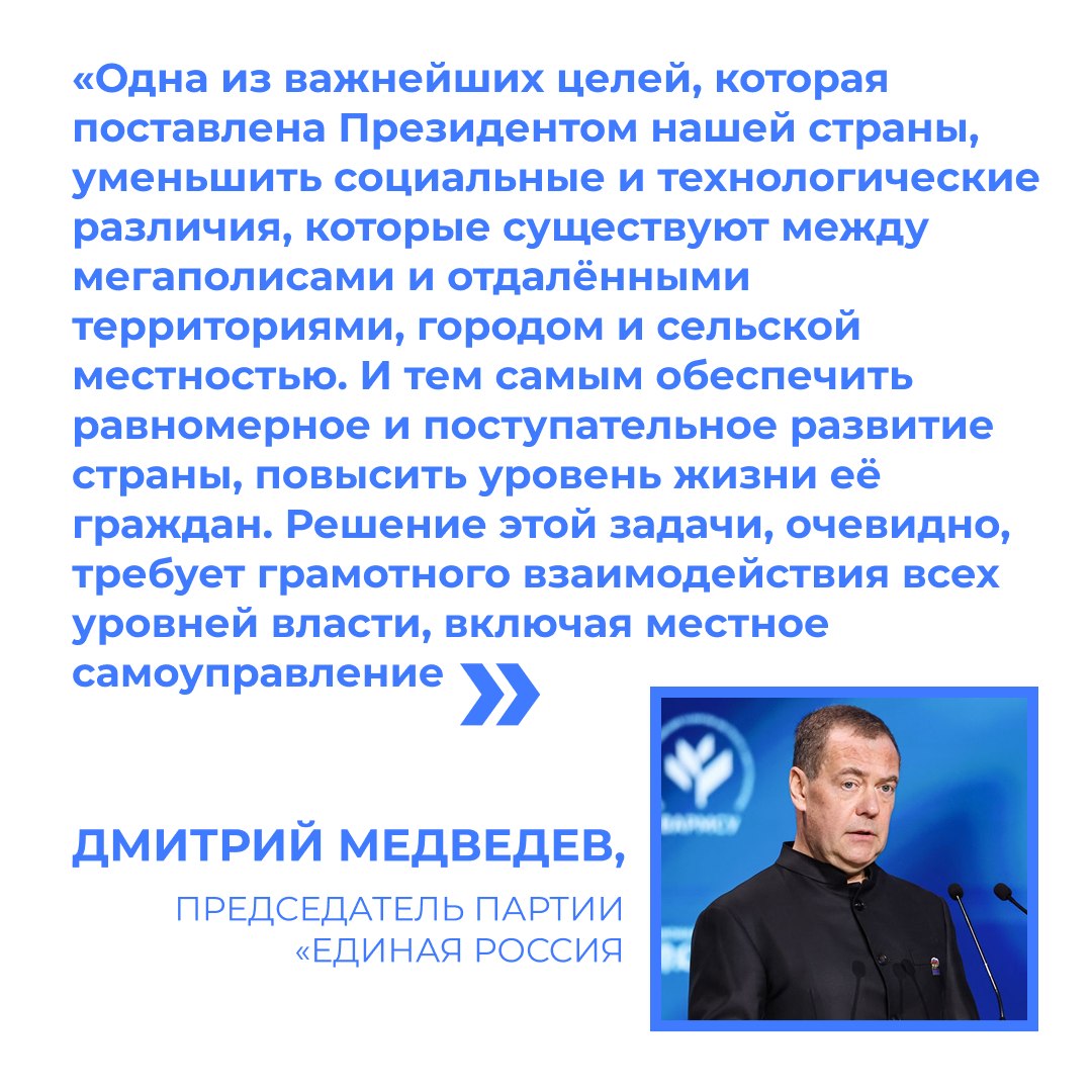 Медведев подчеркнул важность эффективной работы местной власти для развития государства. Он отметил, что одна из целей, поставленных президентом, — уменьшение различий между мегаполисами и отдалёнными территориями и повышение уровня жизни граждан. Решение этой задачи требует взаимодействия всех уровней власти, включая местное самоуправление.