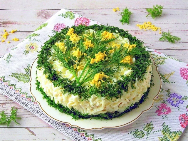 Сверху распределите натертые белки, придавая салату аккуратный внешний вид. По желанию его можно украсить зеленью и оставшимся тертым желтком, имитируя веточку мимозы. Перед подачей стоит выдержать салат в холодильнике около 1,5-2 часов для наилучшего вкуса.