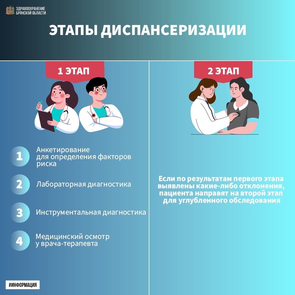 Диспансеризация проходит в несколько этапов. Первый этап включает в себя комплекс обязательных исследований, направленных на выявление признаков заболевания и факторов риска. Если по результатам первого этапа выявлены какие-либо отклонения, пациента направят на второй этап для более углубленного обследования.