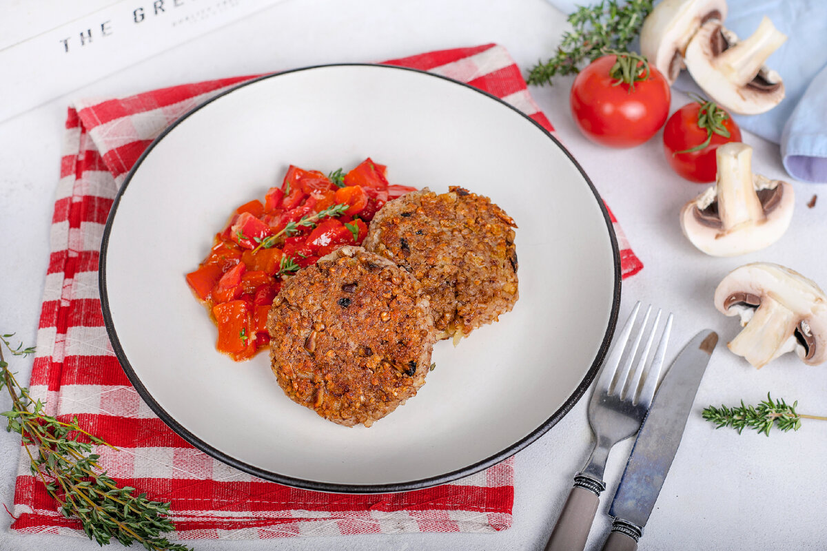 Шаг 3: Разогрейте сковороду и добавьте еще одну столовую ложку растительного масла. Обваляйте котлеты в панировочных сухарях и обжарьте по 3-4 минуты с каждой стороны до золотистой корочки. В это время очистите запечённый перец от кожи и семян, нарежьте его кубиками. Мелко нарежьте чеснок и помидоры, затем смешайте все ингредиенты в салатнице, добавив оливковое масло. Подавайте гречневые котлеты с овощным салатом, наслаждаясь гармонией вкусов и яркими цветами.