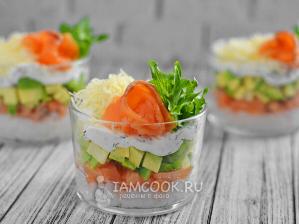 - Ингредиенты: отварной рис, слабосоленая семга, авокадо, творожный сыр, укроп и полутвердый сыр.
