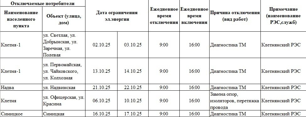 Администрация Клетнянского района Брянской области доводит график отключений населенных пунктов района: