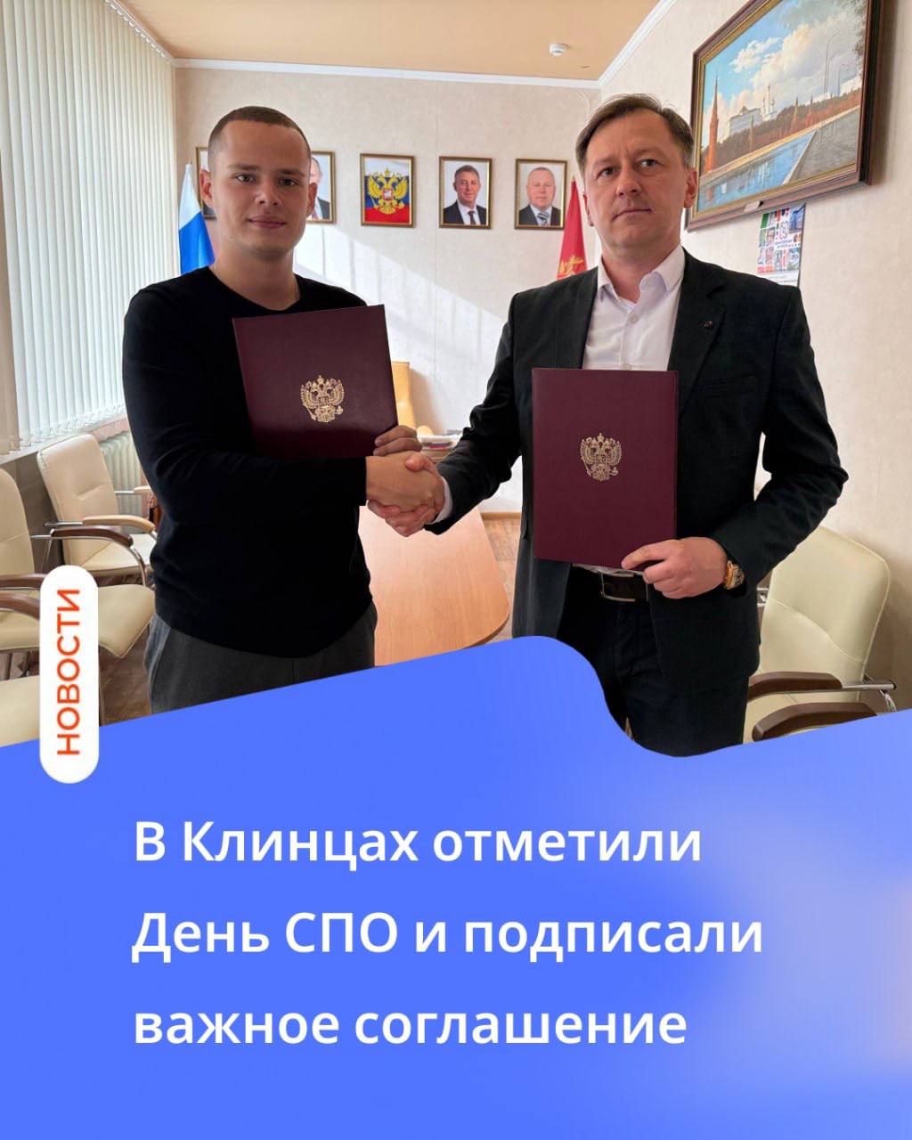 В преддверии праздника состоялось важное событие: руководитель Брянского регионального отделения «Молодой Гвардии Единой России», депутат Клинцовского городского Совета народных депутатов VIII созыва Антон Механиков и директор Клинцовского индустриально-педагогического колледжа Николай Брильков подписали Соглашение о сотрудничестве.