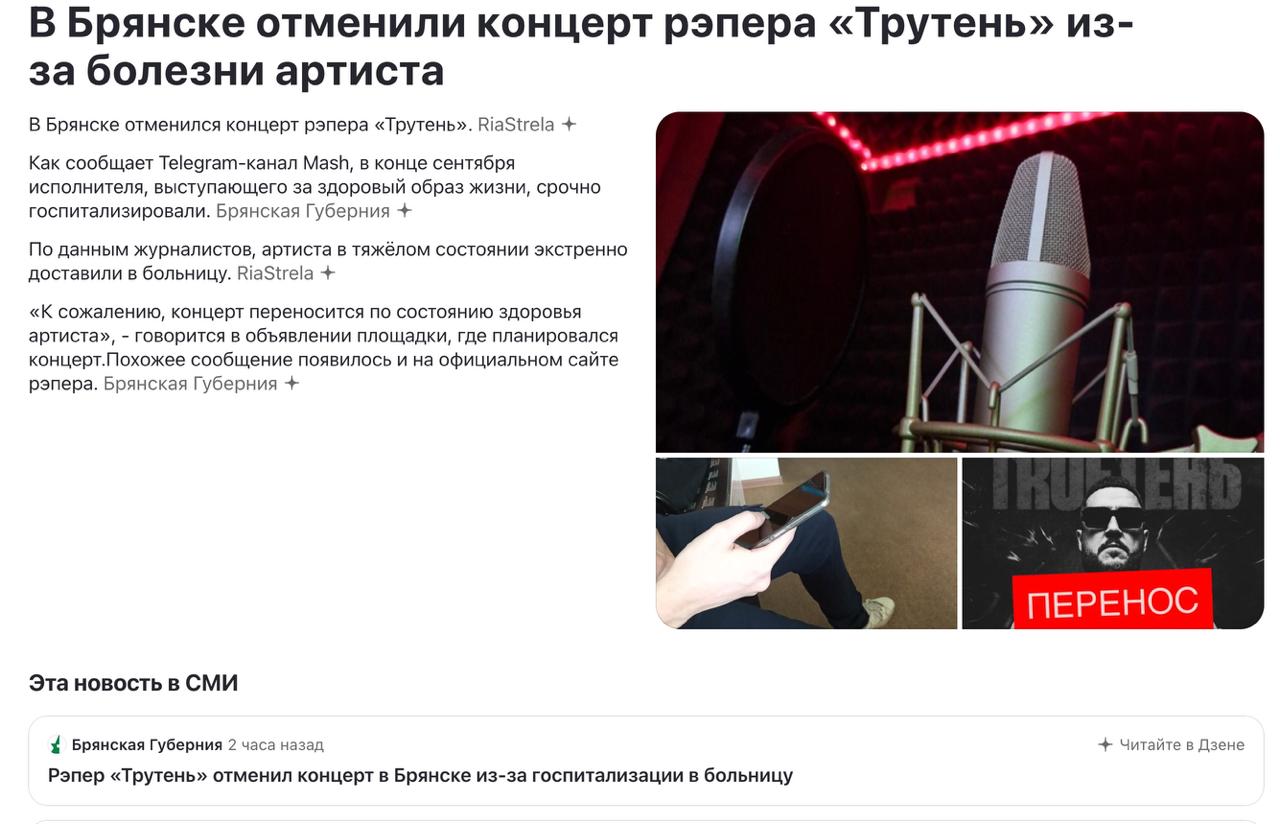 Как пишут в газетах, здоровье его «резко пошатнулось». Публике же объявили, мол, не волнуйтесь, концерт в Брянске состоится, только попозже. Билеты, граждане, не сдавайте. Кто-то, говорят, даже обиделся. Кто-то даже сказал, что, мол, я теперича специально на концерт пойду, чтобы этому Трутню в морду за ЗОЖ плюнуть.