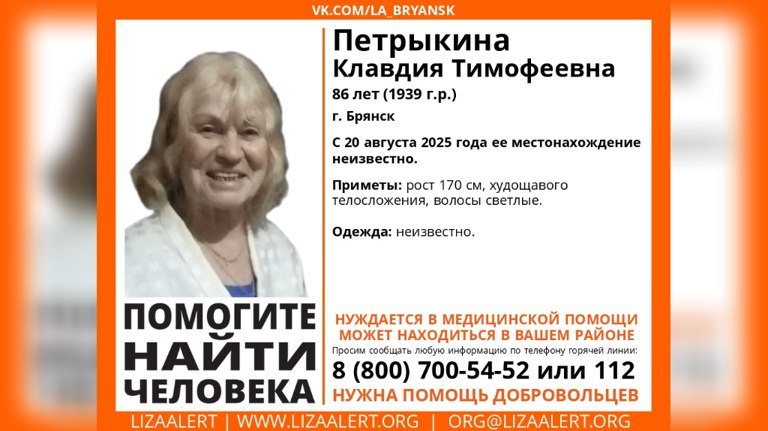 В Брянске пропала 86-летняя женщина, нуждающаяся в медицинской помощи