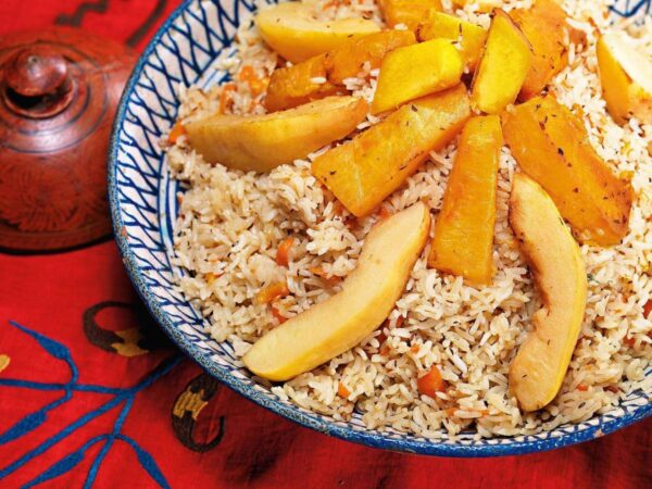 Промытый рис добавить в казан с кипящим зирваком, при необходимости долив воды, готовить до полной готовности. На завершении процесса кладем сверху запечённую тыкву и айву, накрываем крышкой и оставляем томиться на 15-20 минут.