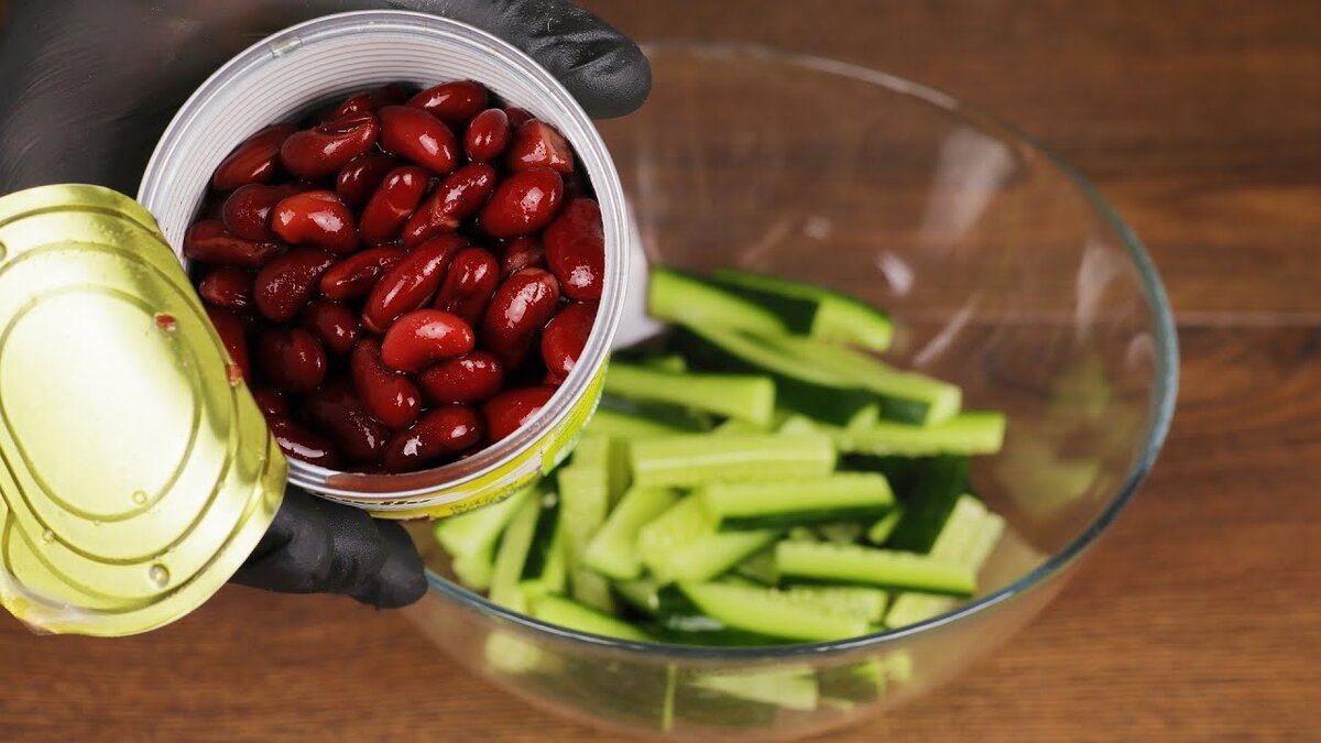 Свежий огурец следует нарезать полосками и выложить в большую емкость. Остывшую курицу также нужно нарезать на более мелкие кусочки и добавить к огурцам. Затем необходимо слить лишнюю жидкость из банки с морковью по-корейски и добавить её к остальным ингредиентам. Фасоль освобождается от жидкости, после чего отправляется в общую массу. Итогом станет добавление соли и перца по вкусу, а завершит процесс заправка майонезом.