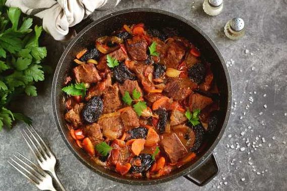В первую очередь говядину обжаривают до золотистой корочки и солят в конце процесса. Затем лук нарезают полукольцами, морковь толстыми кружками, а чеснок — пластинами. Говядину выкладывают на дно горшочка, добавляя слои овощей и чернослива с специями, после чего заливают бульоном с томатной пастой. Накрытые крышками горшочки ставят в холодную духовку и готовят при температуре 160°C в течение 2,5-3 часов. За 30 минут до готовности крышки снимаются, чтобы образовалась аппетитная корочка.