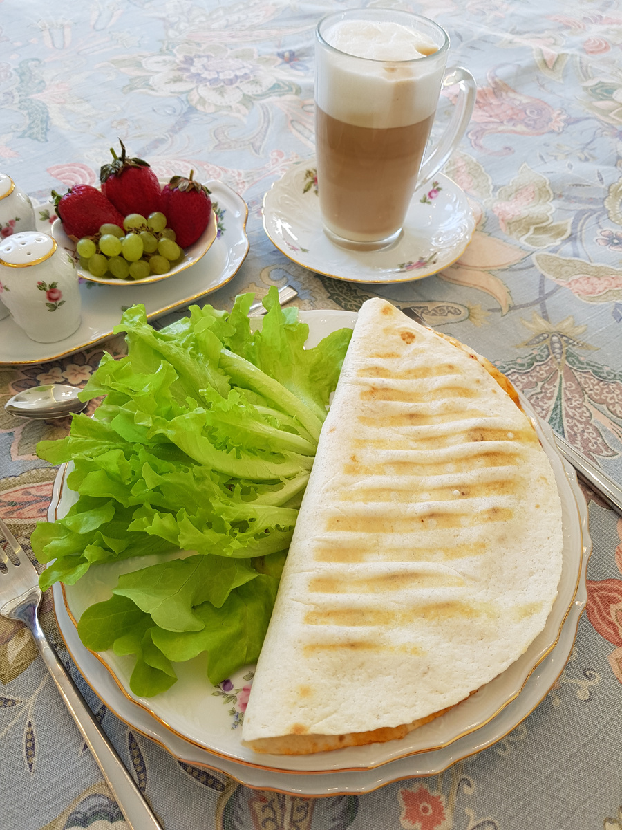 Пока кесадилья запекается, займитесь оформлением. Кесадилью можно сервировать с свежими листьями салата, капучино и ягодами. Это создаст яркую палитру цветов и сделает подачу особенно привлекательной. Наслаждайтесь вкусом и ароматом мексиканского утреннего блюда!