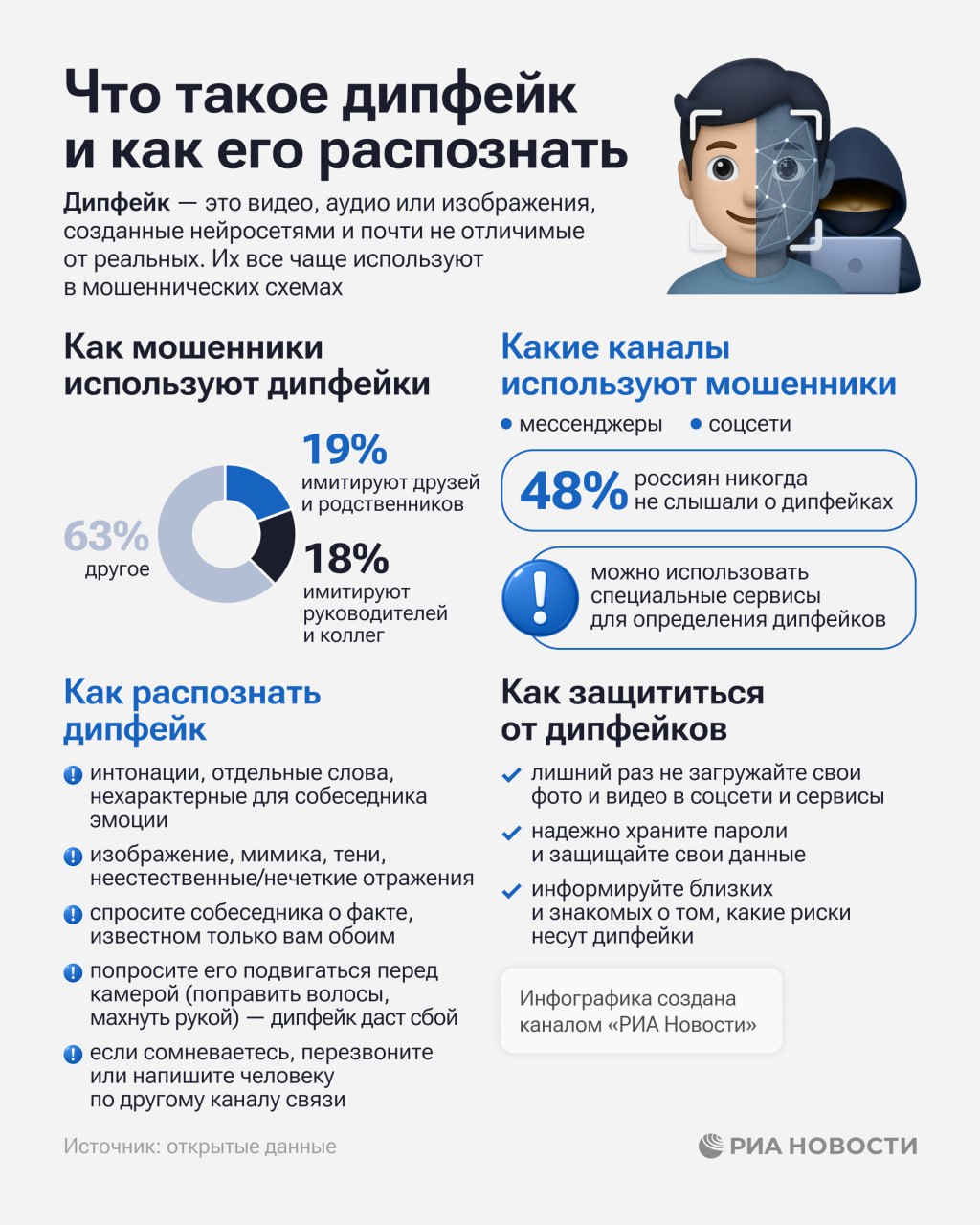 Подробнее о том, как распознать дипфейк - в инфографике РИА Новости.