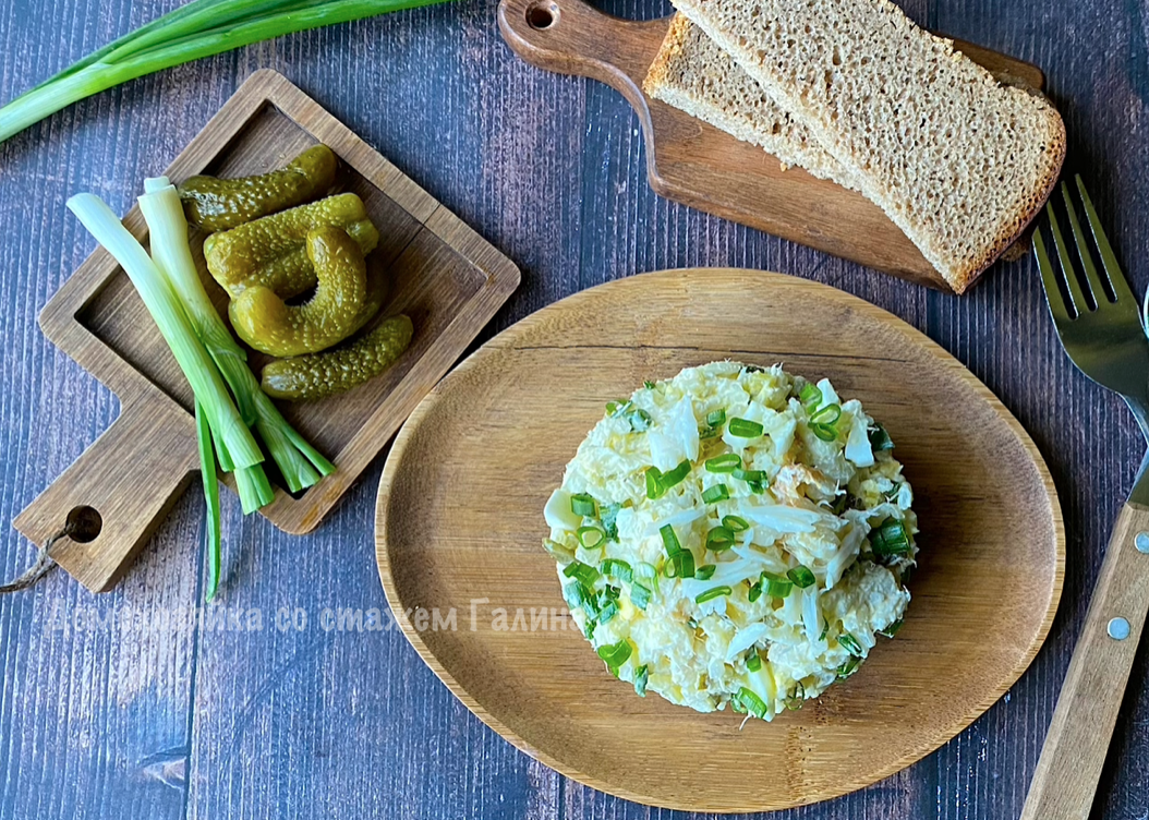 Не забывайте про зелень! Мелко нарезанный зеленый лук придаст салату свежесть, а заправка из майонеза объединит все ингредиенты в одно гармоничное блюдо.