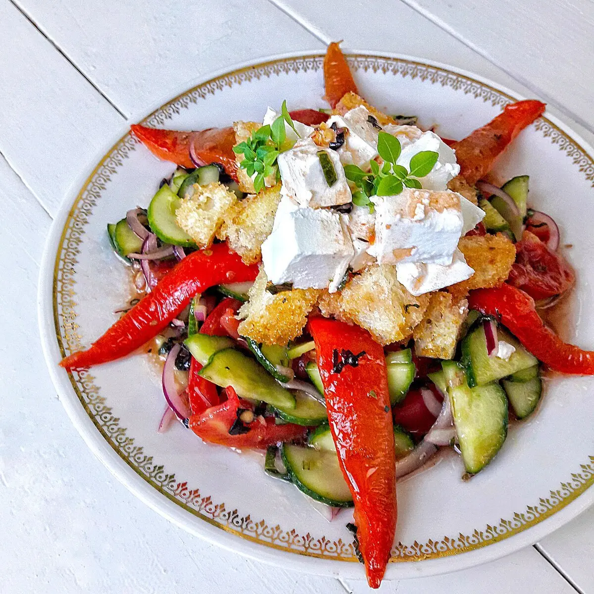 Для завершения блюда посыпают все молотыми перцами и поливают оливковым маслом. Салат можно украсить пшеничными сухариками, а также добавить творожный сыр (как фету, так и сиртаки) для большей насыщенности.
