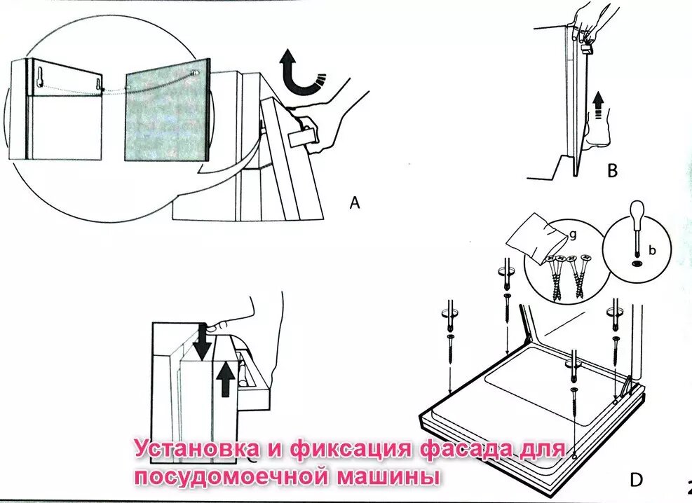 Не забудьте проверить параметры фасадной панели. Например, для узкой модели потребуется фасад шириной 45 см, в то время как полноразмерной машине нужен фасад 60 см. Обязательно уточняйте в инструкции допустимый вес панели.