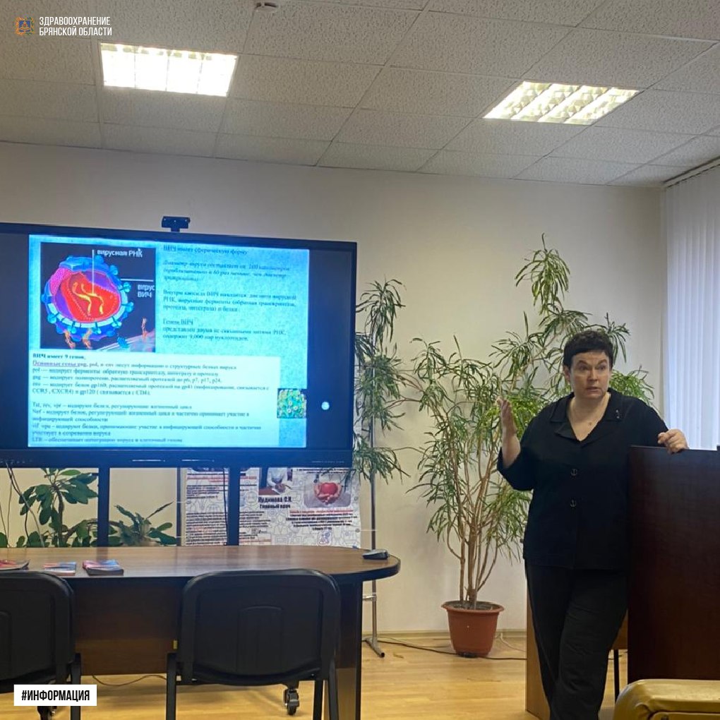 Для сотрудников больницы Людмила Изотова – заведующая отделом профилактики Брянского областного центра по профилактике и борьбе со СПИД, врач-эпидемиолог прочла лекцию на тему «Профилактика ВИЧ-инфекций», основная цель которого – повышение осведомленности персонала о современных методах профилактики, диагностики и лечения. Особое внимание было уделено раннему выявлению и своевременному началу терапии.