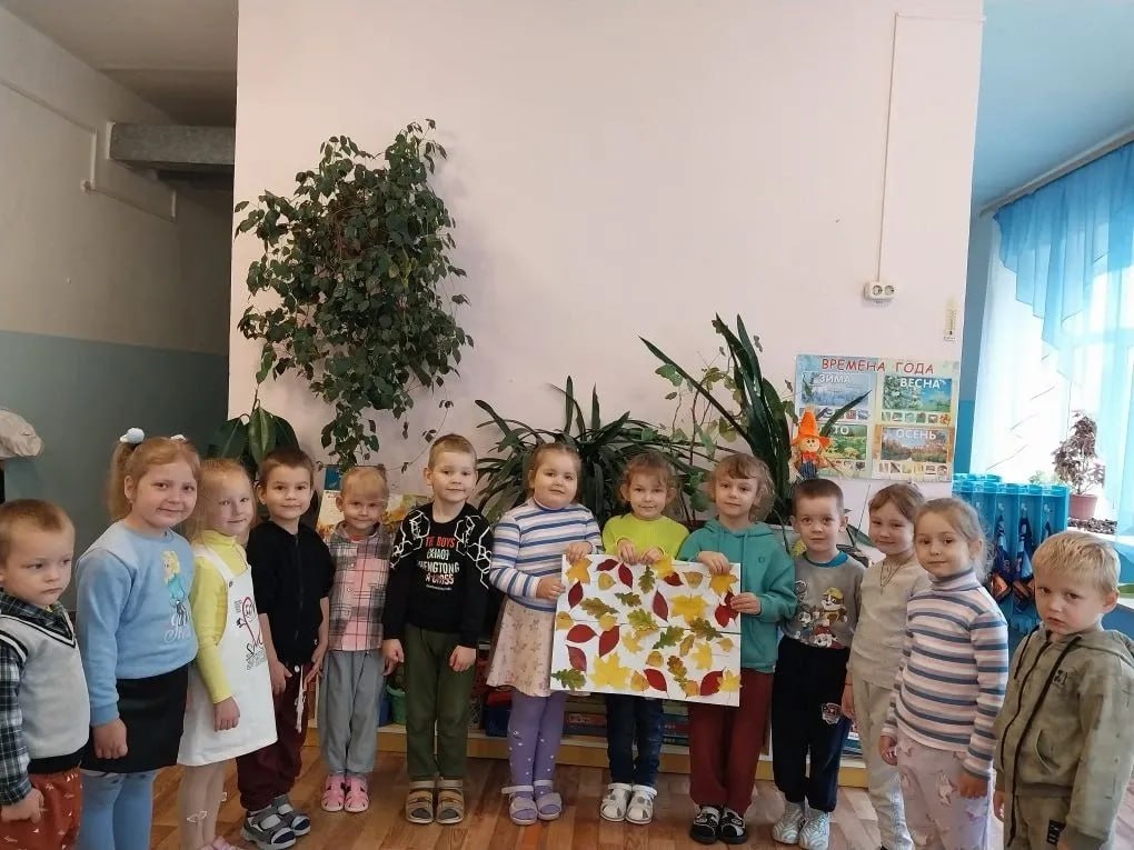 Ребята старшей группы «Колобок», под руководством воспитателя Любови Николаевны, выполнили аппликацию из осенних листьев, которую назвали «Осенний ковер».