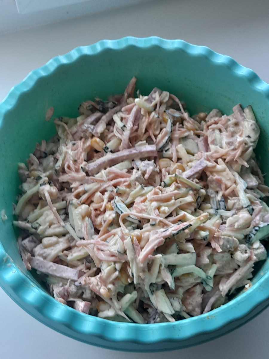 Приготовление этого салата занимает всего несколько минут. Колбасу нарезают соломкой или кубиками, огурцы – тонкими полосками или кубиками. Если кожица огурца жестковата, её можно удалить. Кукурузу предварительно откидывают на дуршлаг, чтобы избавиться от лишней жидкости. Зелень необходимо мелко нарезать. Все ингредиенты смешиваются в одной большой миске: колбаса, огурец, кукуруза и зелень, после чего добавляют майонез, соль и перец. Главное - тщательно перемешать, чтобы все компоненты были равномерно покрыты заправкой.