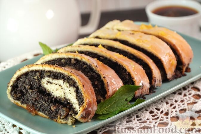 - Рулет с маком, мёдом и орехами. Этот десерт сочетает нежное тесто с насыщенной маковой начинкой и восхитительно ароматным медом. После запекания его следует нарезать на порционные куски и предложить гостям.