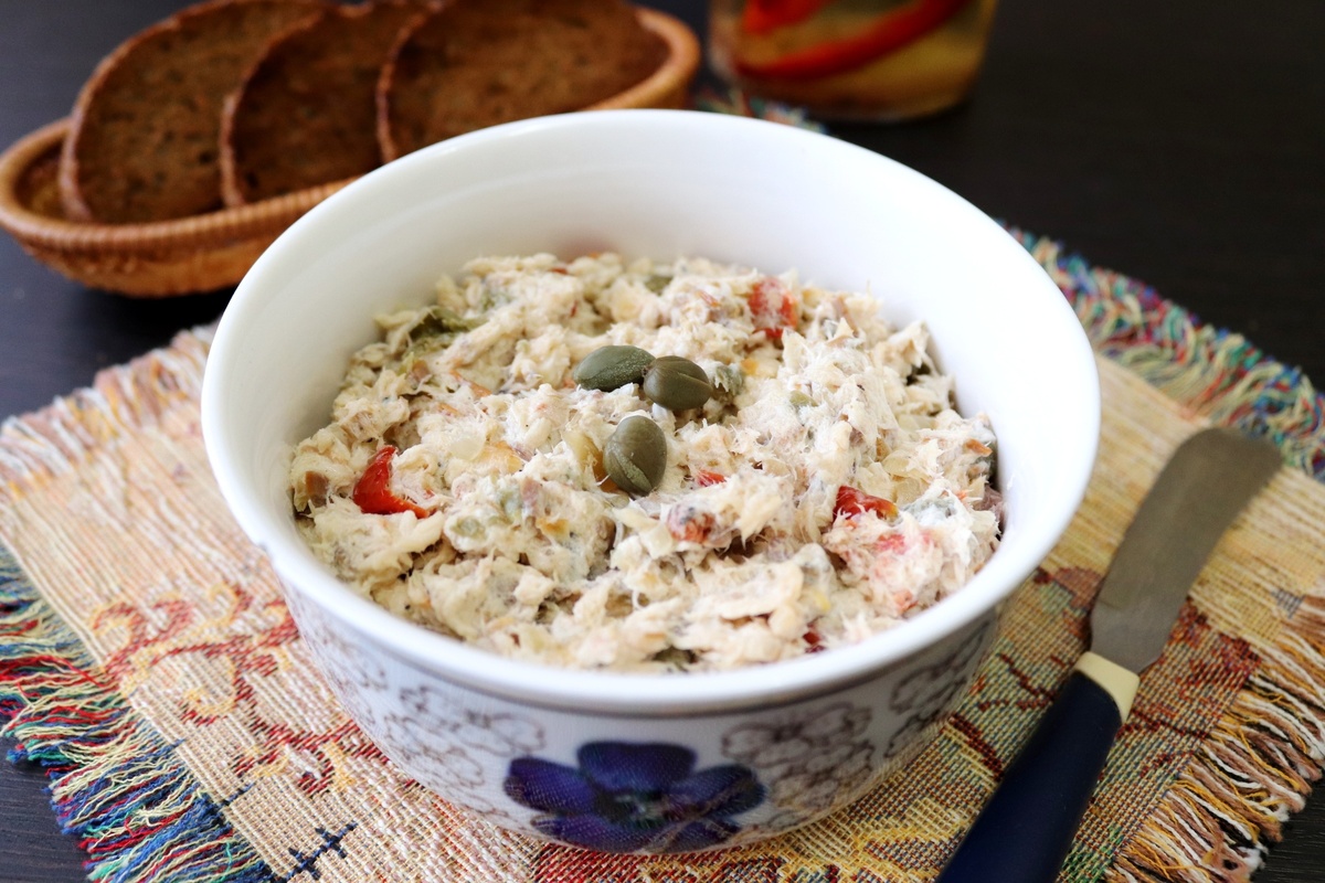 Когда все компоненты будут готовы, настало время смешать их: добавить к рыбе обжаренный лук и нарезанные вяленые томаты. Далее в массу вводится сыр «Сиртаки» — его можно заменить на гладкий творог, мягкий сыр или сливочное масло по вашему вкусу. Для остроты блюда уместны каперсы, которые можно заменить и обычными маринованными огурчиками или немного добавить лимонного сока.