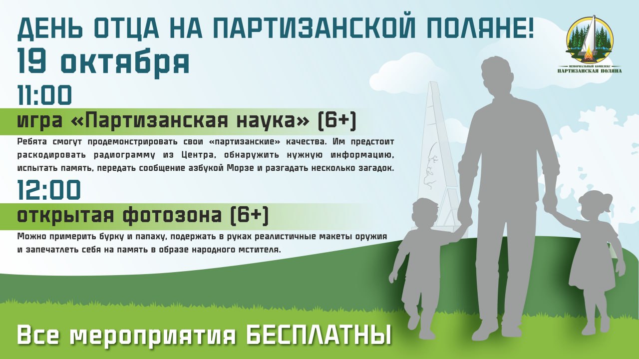 В праздничный день 19 октября Мемориальный комплекс «Партизанская поляна» предлагает особую программу для отцов с детьми. Мероприятия будут проходить в Музее истории партизанского движения с 11:00 до 13:00.