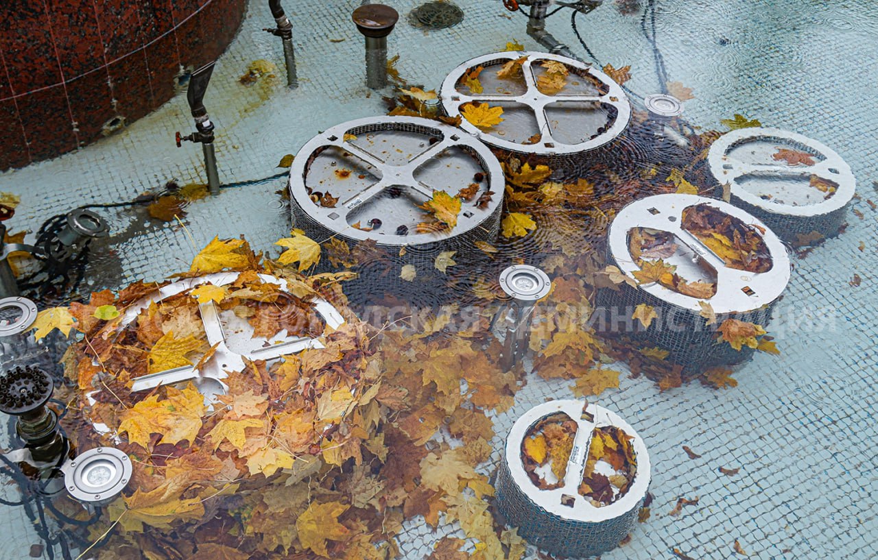 В чашах фонтанов спущена вода и продувают трубопроводы. Такую работу необходимо проделывать для того, чтобы мороз их не повредил.
