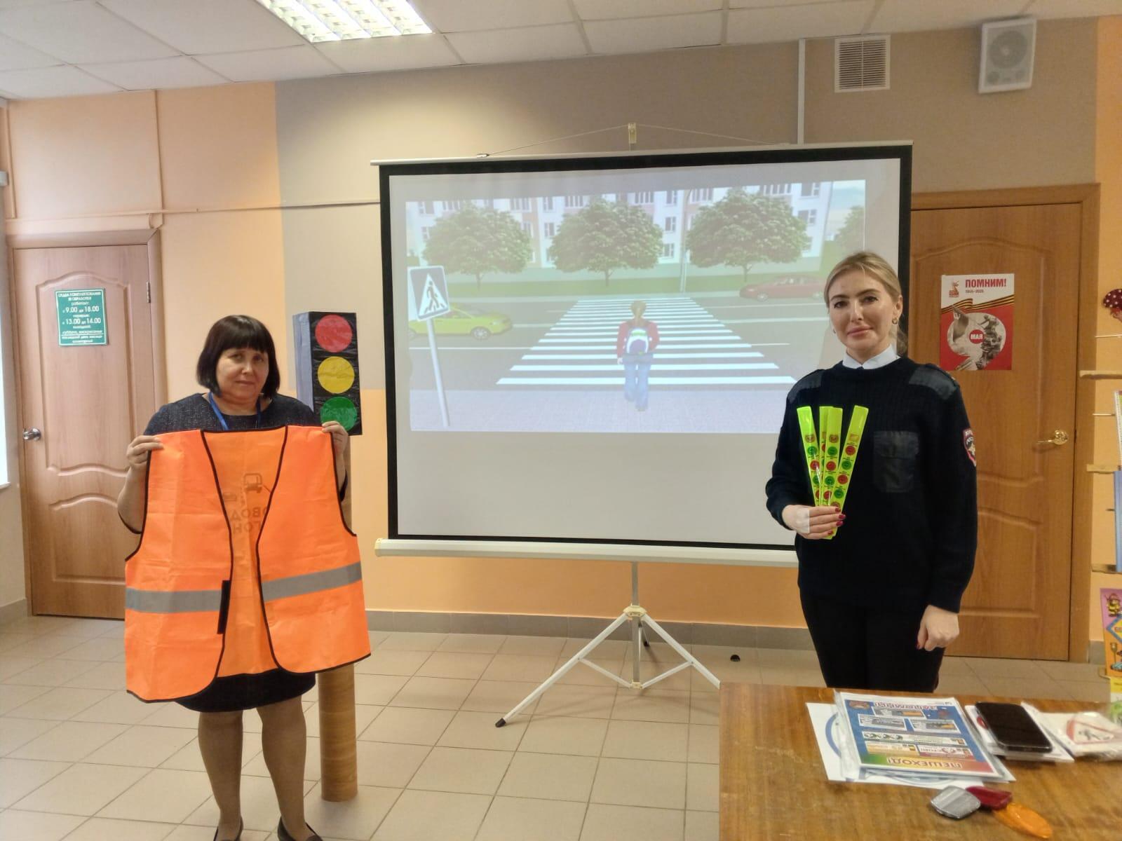 Татьяна Михайловна показала какие светоотражающие элементы должны быть у каждого пешехода. Ведущим библиотекарем Заступенко М.В. был проведен обзор книг для детей о правилах дорожного движения.