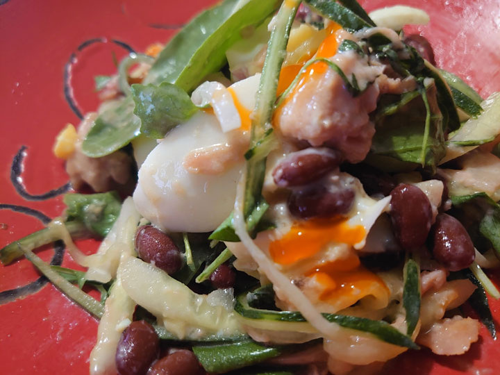 Для начала, вареную фасоль можно заменить на консервированную, выбирая сорта без добавления сахара. Огурцы нарезаются в виде спагетти, а затем поочередно добавляются тунцовые кусочки, нарезанный лук, фасоль и свежая зелень. В завершающий этап кладут нарезанные яйца. Майонез, обладая жёлтым оттенком благодаря рыжиковому маслу, создает уникальную текстуру, а греческий йогурт хорошо сбалансирует вкус соуса.