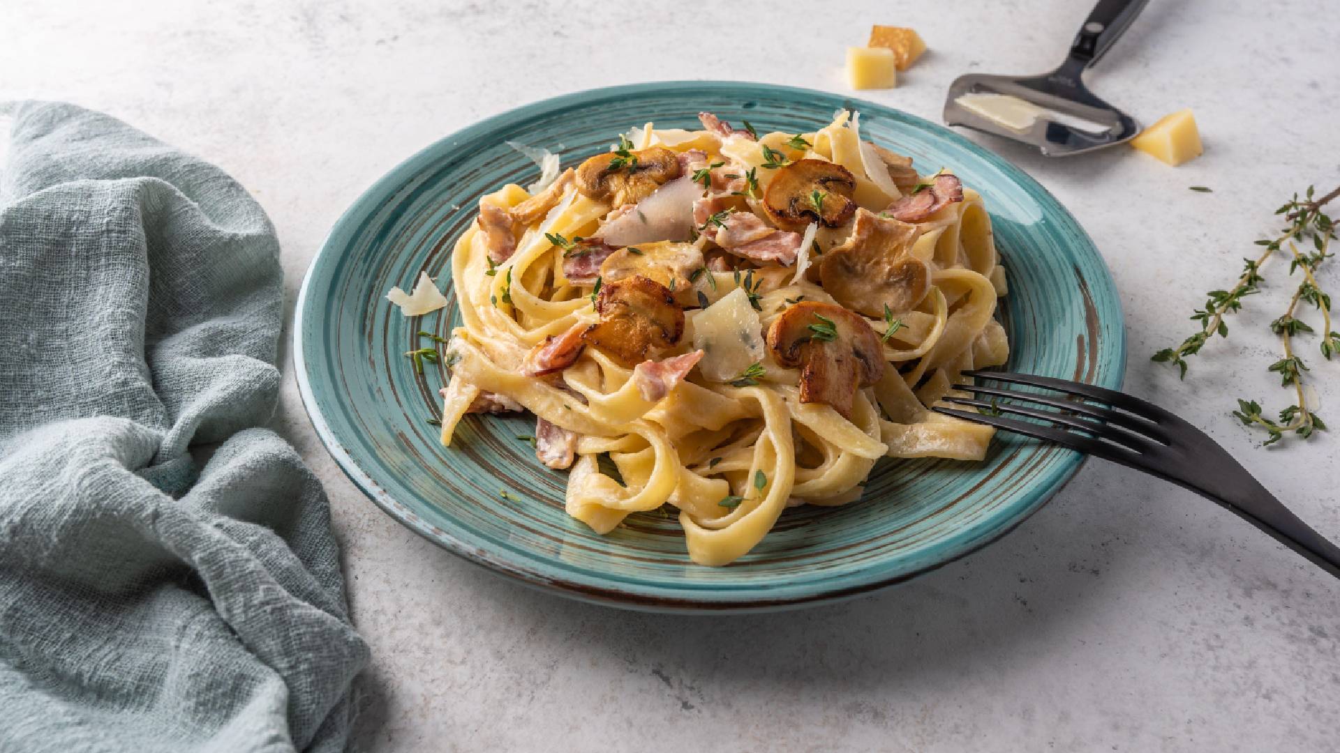 Отварите пасту в подсоленной воде по инструкции на упаковке. Нарежьте бекон и шампиньоны. Поджарьте мясо на сухой сковороде на среднем огне и переложите на бумажное полотенце. Жир, который вытопился, не выливайте, а подрумяньте на нем грибы за 5–6 минут. Добавьте измельченный чеснок и обжаривайте 30 секунд. Переложите грибы к бекону.