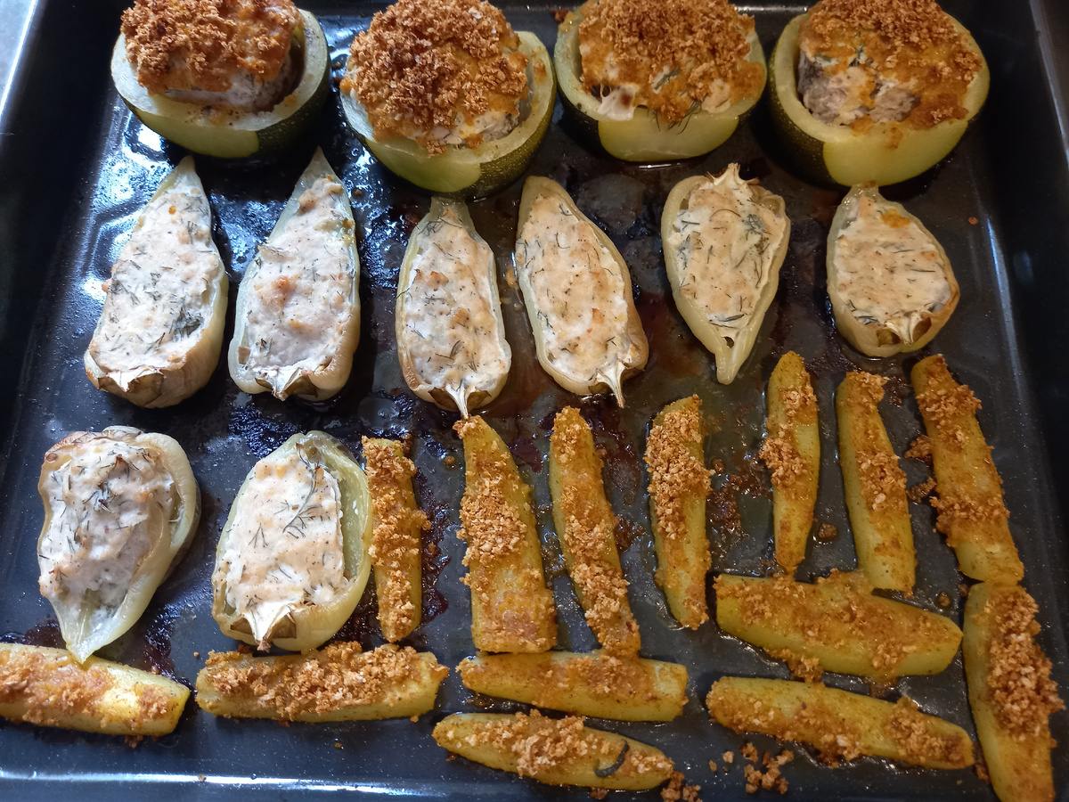 Добавление яйца придаст фаршу сочность, а мелко нарезанная зелень – аромат. Оставшиеся кабачки нарезать на дольки, которые можно обвалять в специально приготовленной овощной посыпке из измельченных орехов, сухарей и специй в зависимости от предпочтений. Все готовые овощи размещают на смазанном растительным маслом противне и отправляют в предварительно разогретую духовку на 40 минут при температуре 180°C.