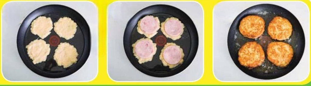 Разогреть сковороду с растительным маслом на среднем огне. Добавить раздавленный зубчик чеснока для аромата и выкладывать картофельную массу в виде лепешек. Не забыть положить на каждую лепешку кружочек ветчины, который затем накрывается еще одной ложкой картофельного теста. Необходимо слегка прижать, чтобы сочетание было более устойчивым.