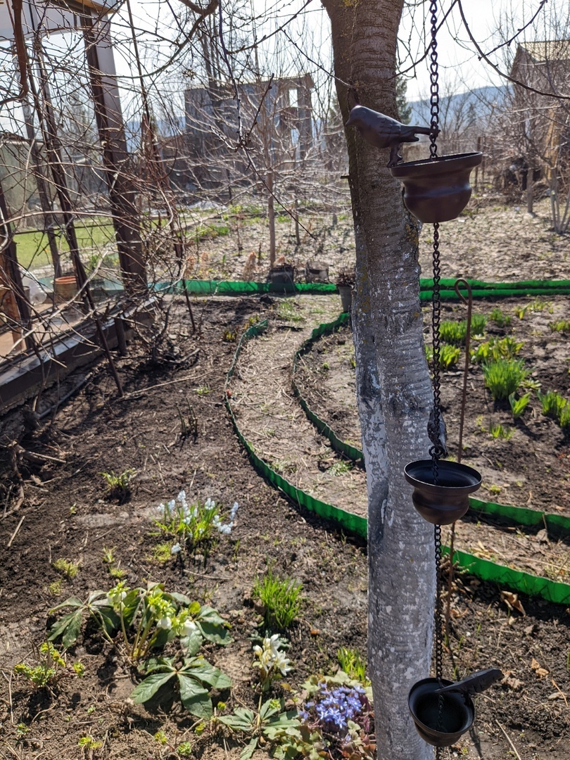 Теневой миксбордер, выходящий на запад, постепенно наполняется красотой. Однако радикальные изменения здесь не требуются, поскольку за несколько лет сложно было найти место для лопаты без риска повредить корни уже укоренившихся растений. При этом весной, когда на старой вишне нет листвы, цветник оказывается под палящим солнцем и превращается в яркое место, где сами весенние первоцветы восхищают своим видом.