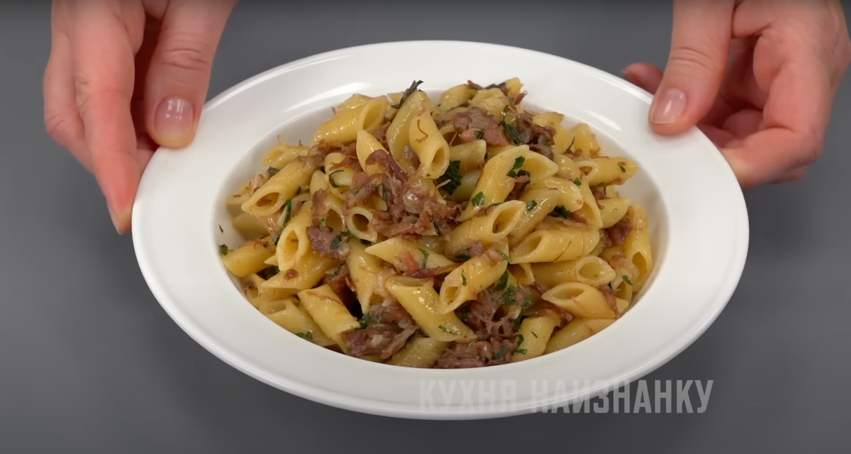 Не забывайте о макаронах: в это время ставьте на огонь кастрюлю с водой, добавляя несколько капель растительного масла. Варите их до состояния "аль денте" согласно инструкции на упаковке. Параллельно с тушёнкой добавляют чёрный перец, готовя до тех пор, пока не выпарится лишняя жидкость.