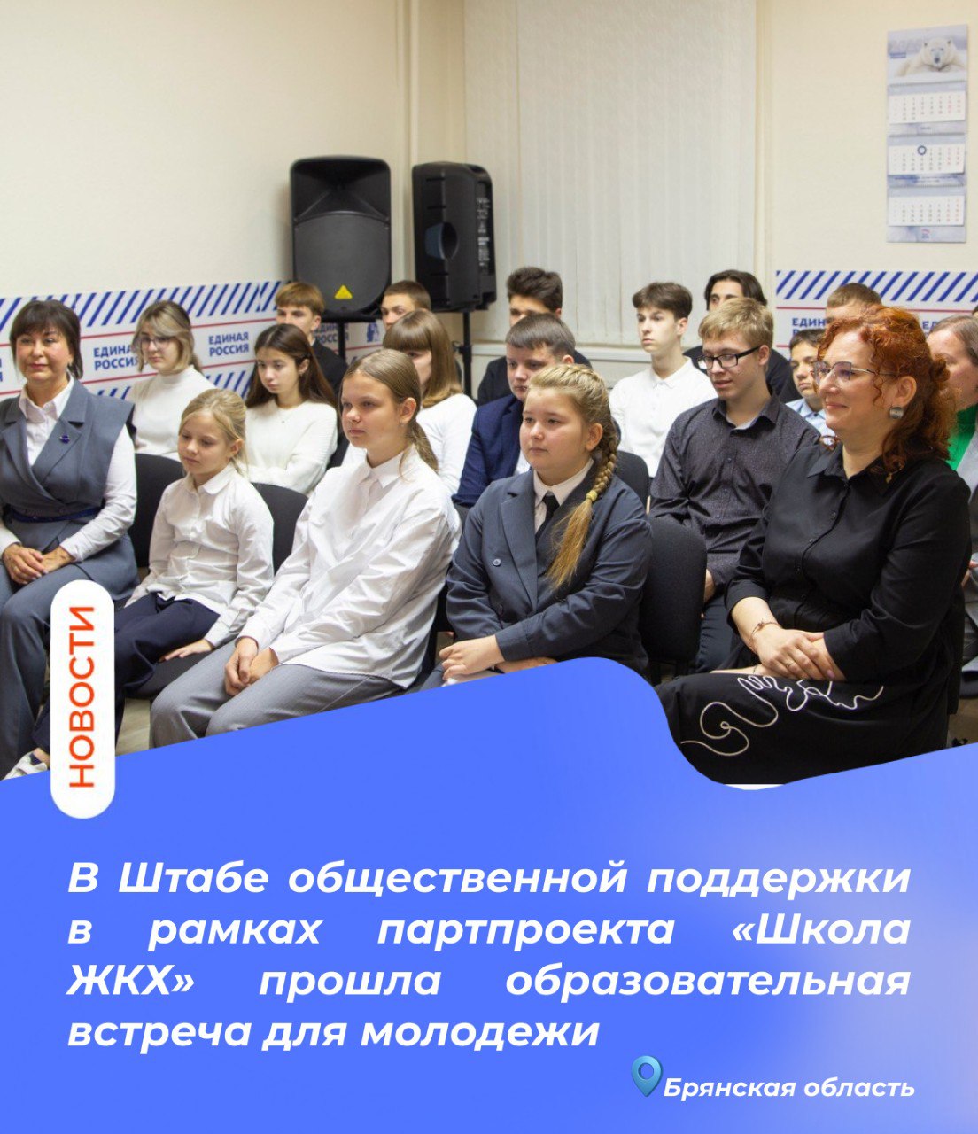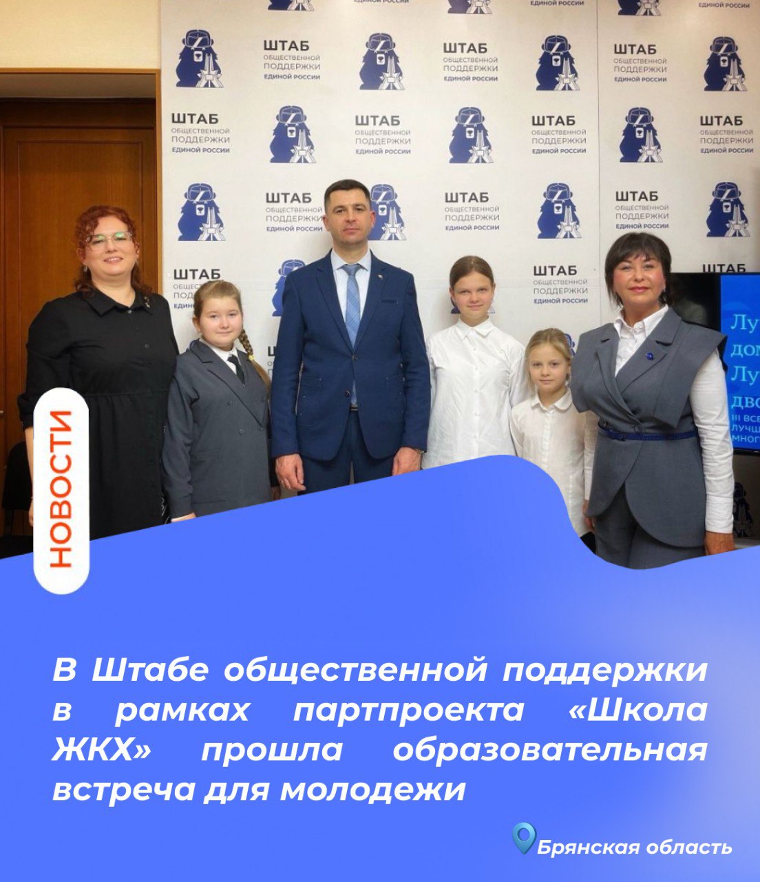 На площадке Штаба общественной поддержки «Единой России» в Брянской области состоялась встреча в рамках федерального партийного проекта «Школа ЖКХ». При поддержке Региональной общественной приёмной Председателя Всероссийской политической партии «Единая Россия» Д.А. Медведева состоялась встреча регионального координатора федерального партийного проекта «Школа ЖКХ, начальника Государственной жилищной инспекции Брянской области Александра Агафонова с учащимися брянских школ №2, № 56 и молодыми активистами ТОС города Брянска на тему «Всё о ЖКХ».