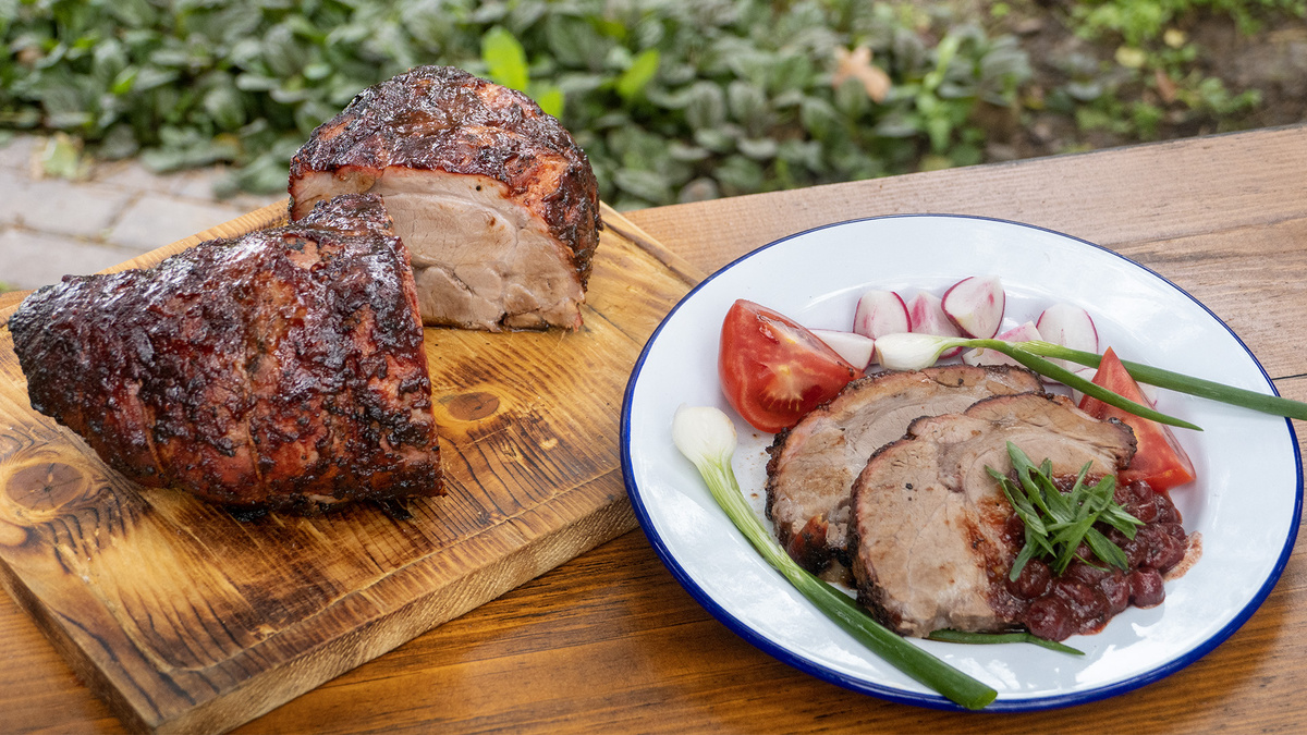 После этого мясо освобождают от каната и оставляют «отдохнуть» на 10 минут перед нарезкой. Подается свиная шея с вишневыми соусом и свежими овощами — настоящее наслаждение для всех любителей мясных деликатесов.