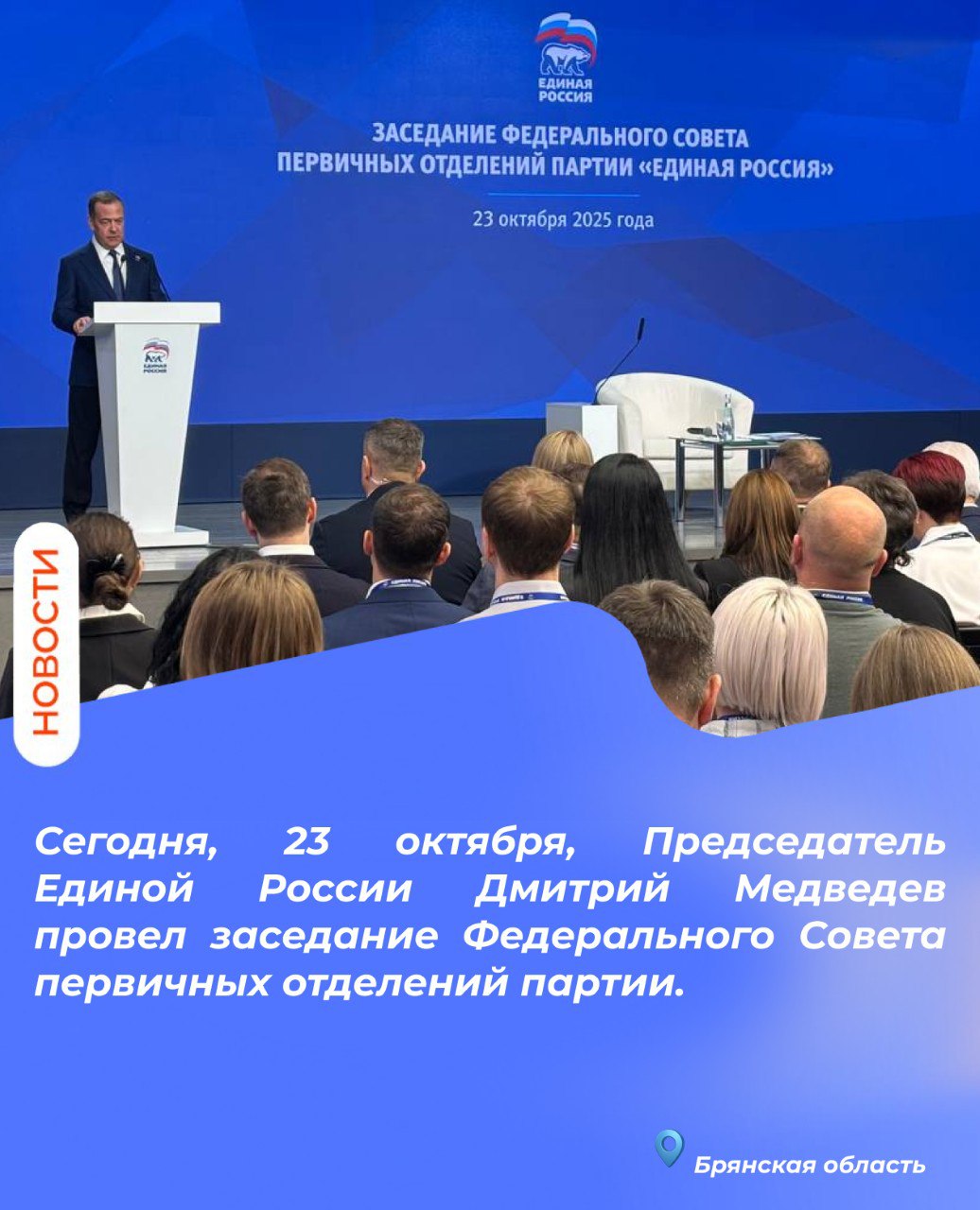 Сегодня, 23 октября, Председатель Единой России Дмитрий Медведев провел заседание Федерального Совета первичных отделений партии.