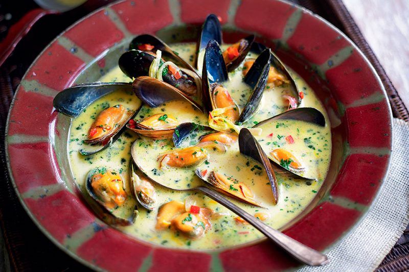 - Мидии – ключевой ингредиент, придающий блюду насыщенный морской вкус.