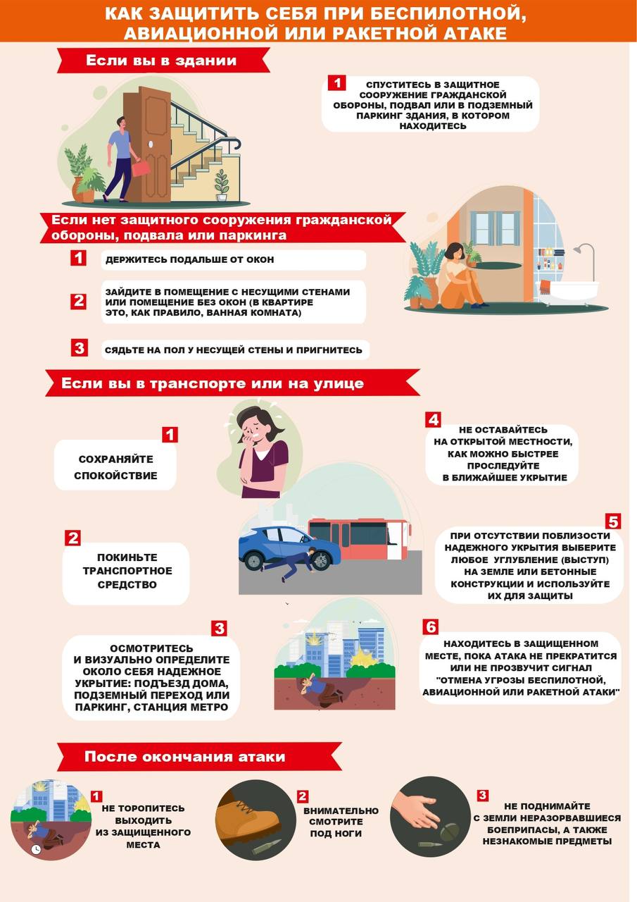 Порядок действий в случае поступления сигнала гражданской обороны "Внимание всем. Беспилотная опасность" определен Министерством по делам гражданской обороны, чрезвычайным ситуациям и ликвидации последствий стихийных бедствий (МЧС). В случае поступления сигнала "Внимание всем. Беспилотная опасность" необходимо оставаться в помещении, по возможности без окон и с капитальными стенами. Если вы находитесь на улице или в транспорте, направляйтесь в ближайшее укрытие или иное безопасное место. До поступления сигнала "Отбой беспилотной опасности" необходимо находиться в укрытии. В целях получения оперативной и достоверной информации о возникающих опасностях скачайте и установите на телефон мобильное приложение "МЧС России".