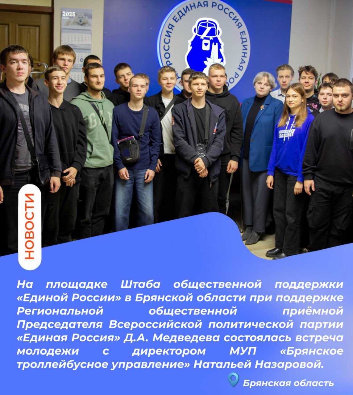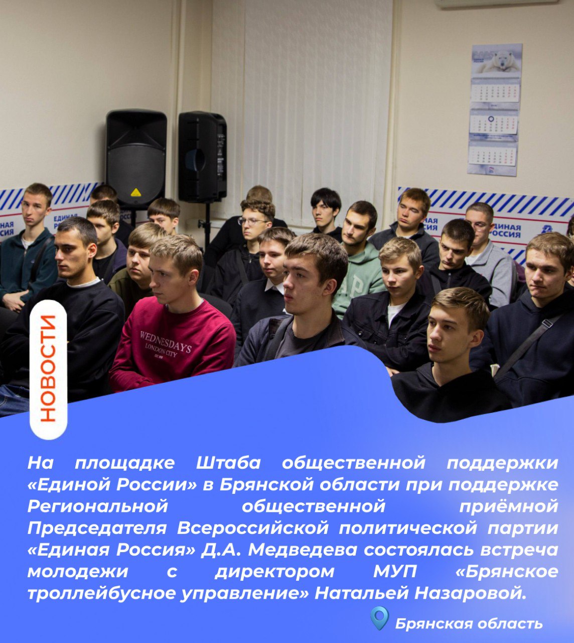 На площадке Штаба общественной поддержки «Единой России» в Брянской области при поддержке Региональной общественной приёмной Председателя Всероссийской политической партии «Единая Россия» Д.А. Медведева состоялась встреча молодежи с директором МУП «Брянское троллейбусное управление» Натальей Назаровой.